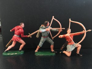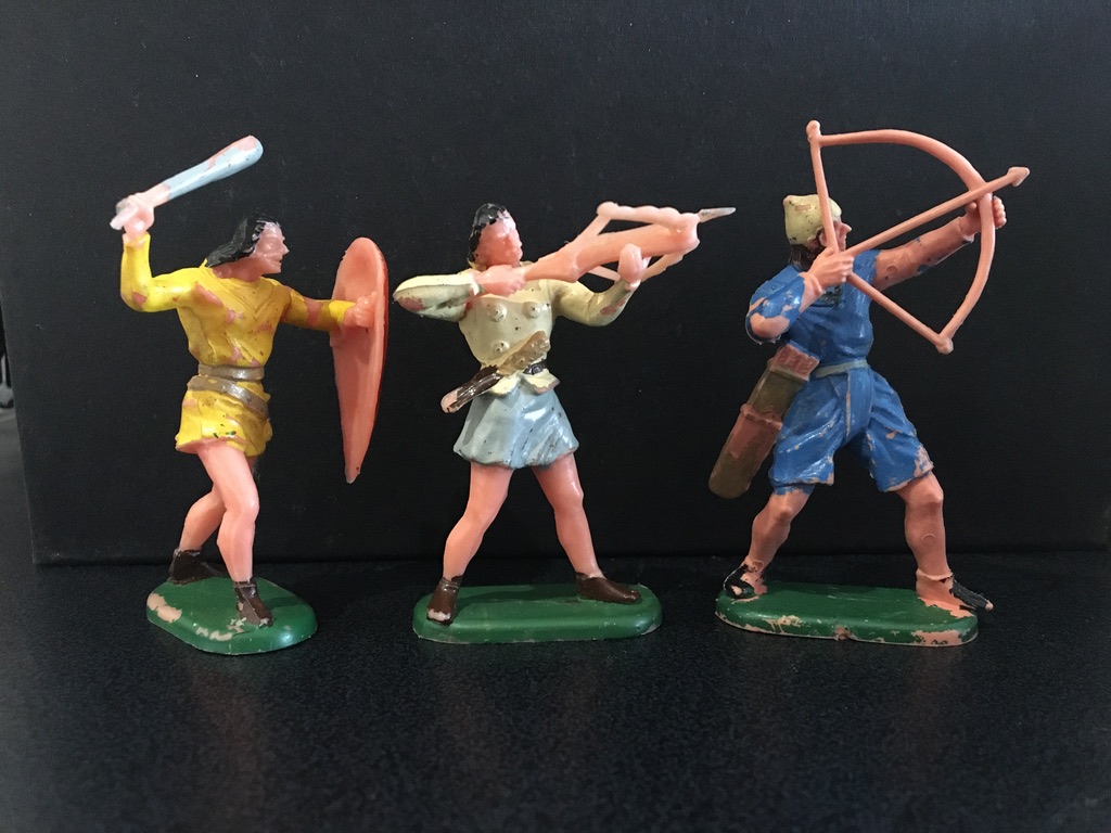 I didn’t return to the UK often during those military days but when I did I was always loaded down with toy soldiers. Over the years I have off-loaded most of the Elastolins. But, despite being one of their cheapest ranges, I’ve always liked the 70mm soft plastic (weichplastic) Bayeux tapestry inspired Norman/Saxon figures. Quirky and mostly with one separate and therefore movable arm, they’re some of the few Elastolin figures I retained. Originals examples are easily identified because it’s almost impossible to mess with the soft plastic, and they are simply painted, with only a few colour variations, sometimes only the shields colours. The set also includes one of my favourite plastic toy figures; the crossbowman; the Norman army had many such auxiliaries and hats-off to Elastolin for depicting them. So here are the six unarmoured figures, the soft plastic foot knights that accompanied them might come at another time. Elastolin later issued a set of magnificent 70mm mounted Norman knights, probably some of the best figures they produced but they never re-issued these figures in their hard plastic; we had to wait until Preiser took over for that and I still prefer these original Elastolin ones
