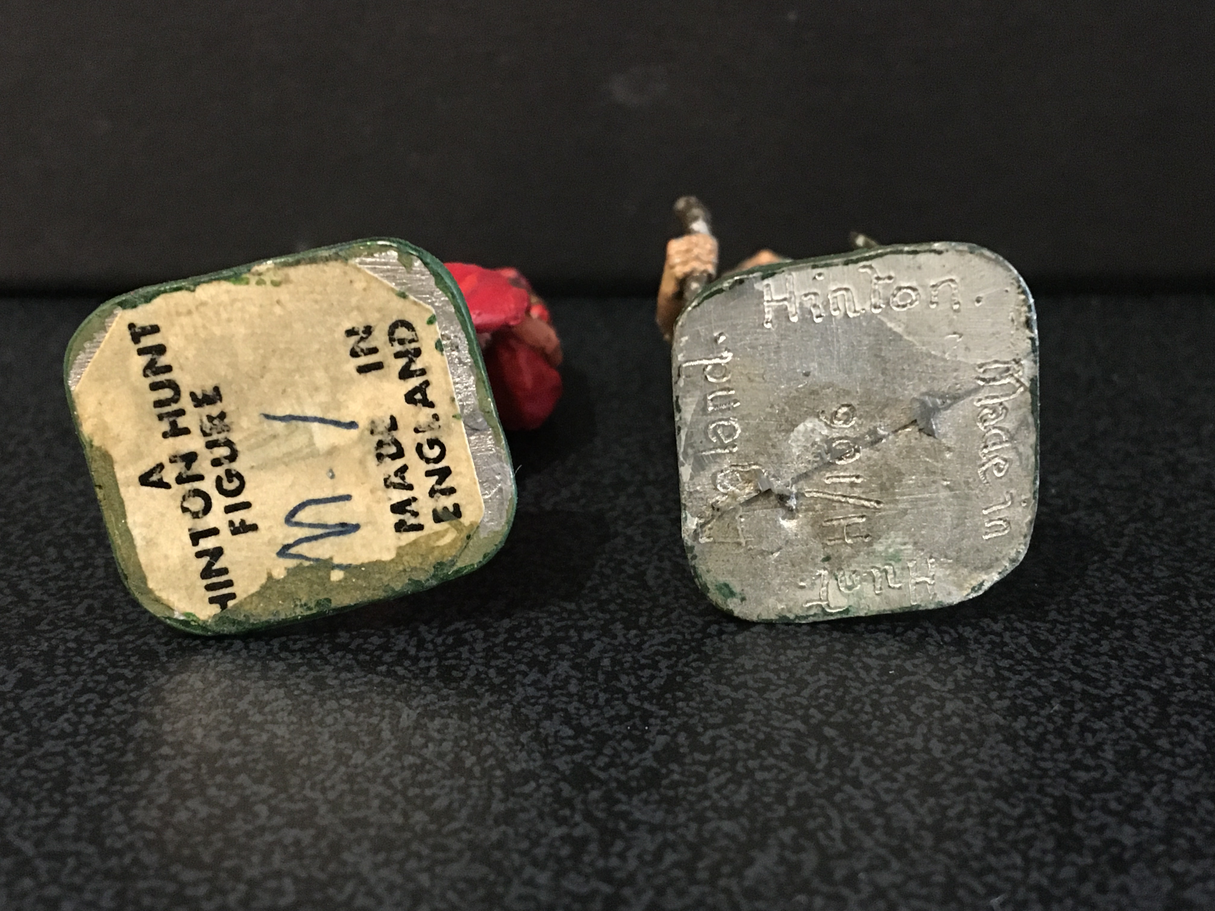 This post introduces the early 54mm solid based Hinton Hunt figures. Marcus Hinton’s first commercial figures did not have the brass shim bases that are one of the ways to differentiate his later figures from similar ones produced by Charles Stadden and the Lasset range by John Tassel; their bases were tin shim. The bases of these early Hinton Hunts were cast and engraved underneath, very similar in style to those of his wargame figures. See photo, the label on the left was commonly used.