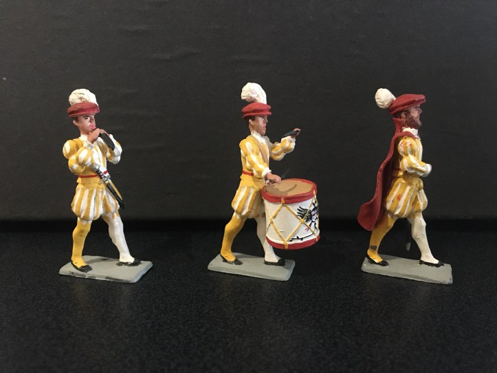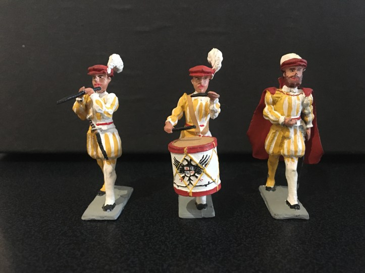 All units common to the Holy Roman Emperor, Carlos V army are depicted; beautifully liveried guard regiments and mercenary landsknechts, each accompanied by drummers and fifers, standard bearers, foot and mounted officers. There are various orders of knighthood and cavalry, each with their banners and trumpeters, and artillery. It is a collection that I’ll never complete, the fun is hunting for them.