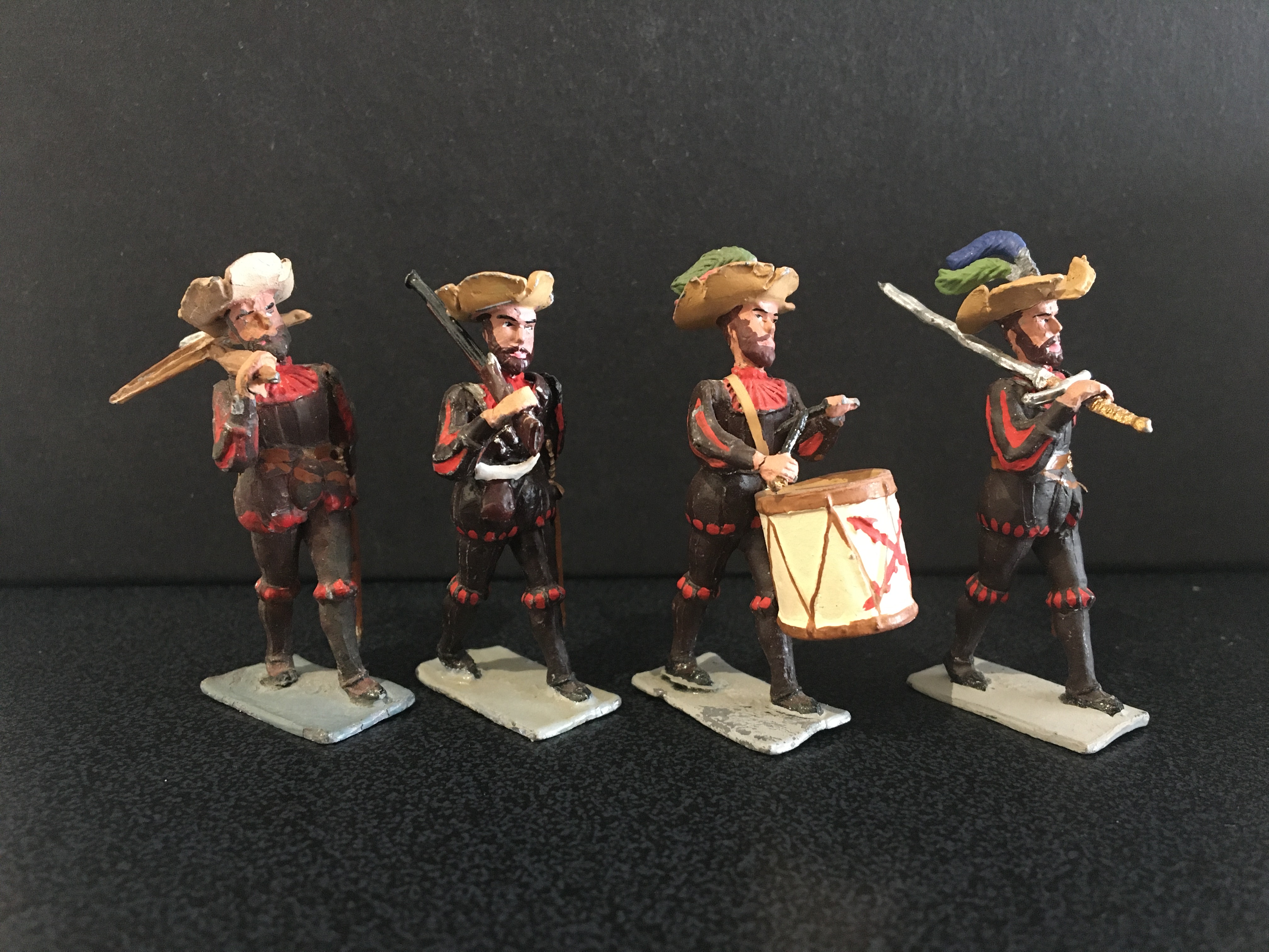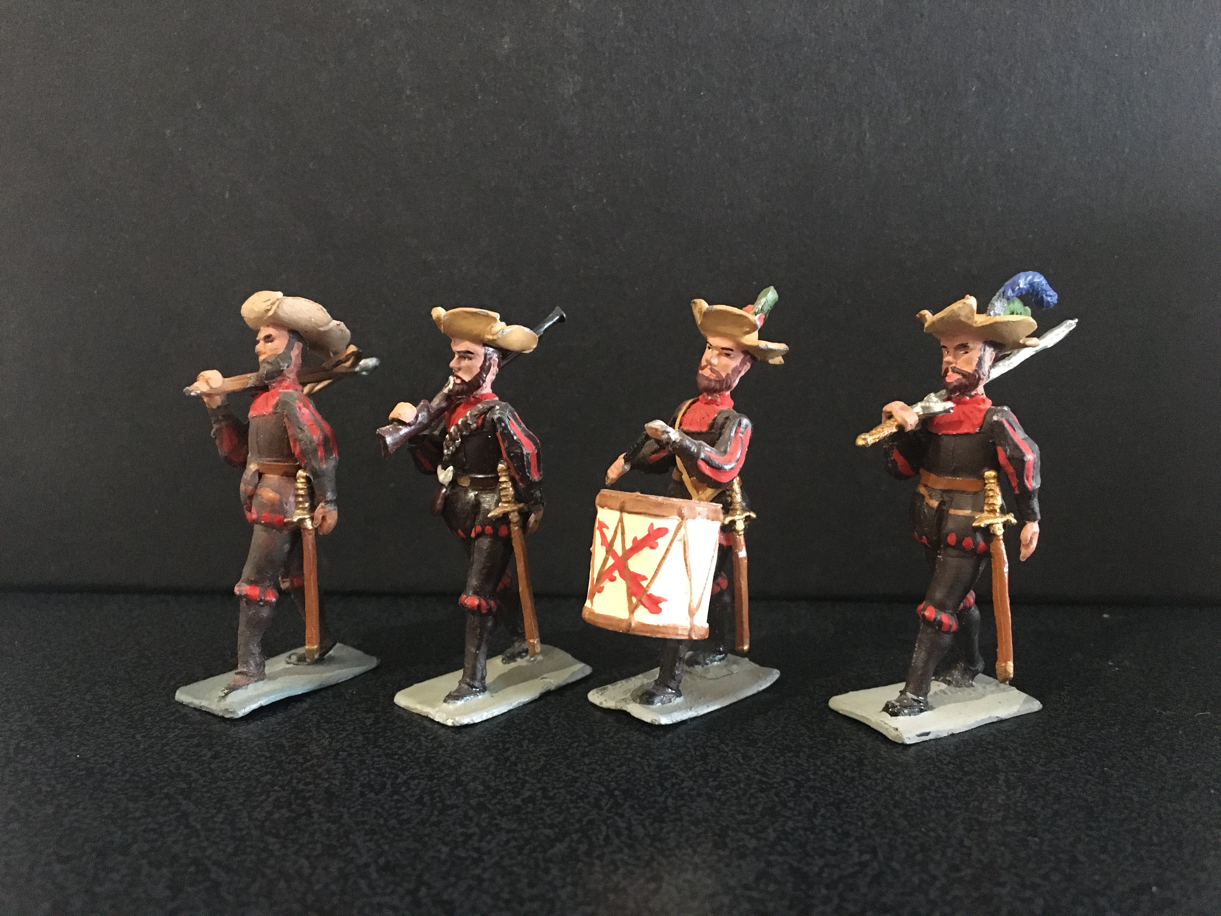 These are the Spanish imperial infantry troops; an officer on foot ,the fifes and drums, a pikeman and harquebusier.