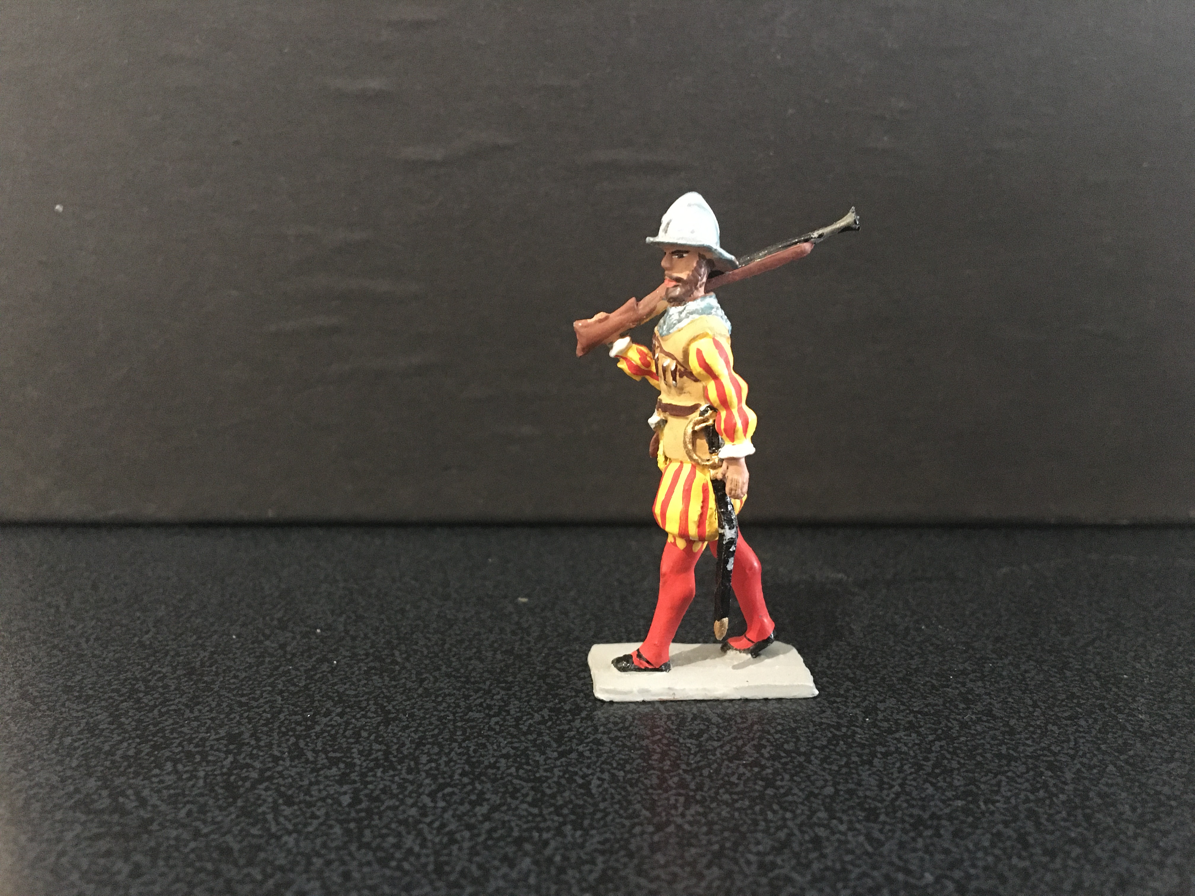 This is the first post showing the work of Sanquez; a Spanish toy soldier maker. These figures were probably made from the 1950’s to 1980’s, I’m not absolutely sure. Sanquez made other earlier figures in other scales but I don’t know much about them. I’m drawn to this range by the subject; a Spanish renaissance army, the distinctive style of sculpture, and the breadth of the range. Over the last 20 or so years I’ve collected a good representation, but there are still many figures I haven’t managed to find, amongst which is a magnificent ox-drawn siege gun, although I do have a few of the figures that accompanied it.