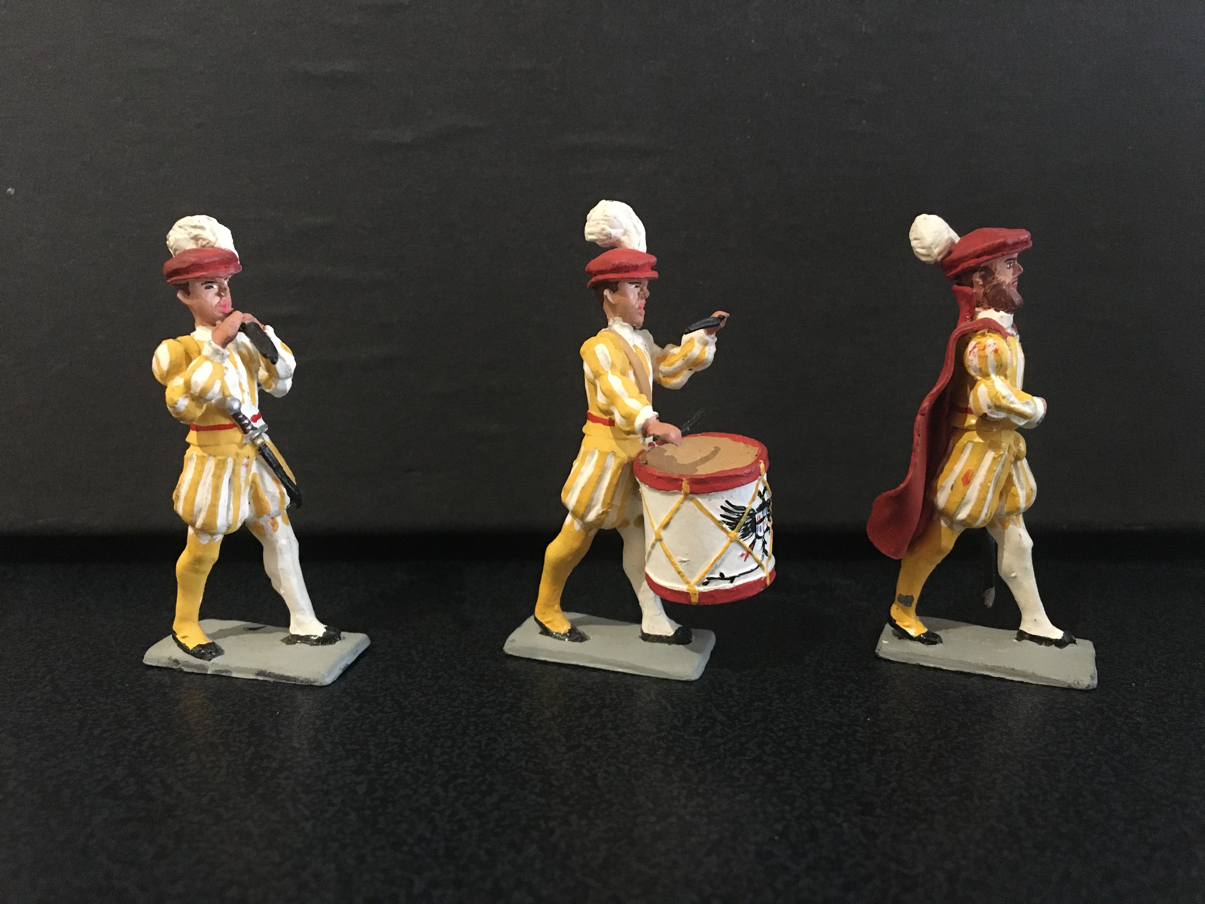 Below are some of the Landsknechts, mercenaries that all the great powers of the 16th century relied on to fight their constant wars. Some, like these below, wore elaborate clothing in a distinct colour. The third image shows how Sanquez marked all his figures with his name raised on the top of the cast base.