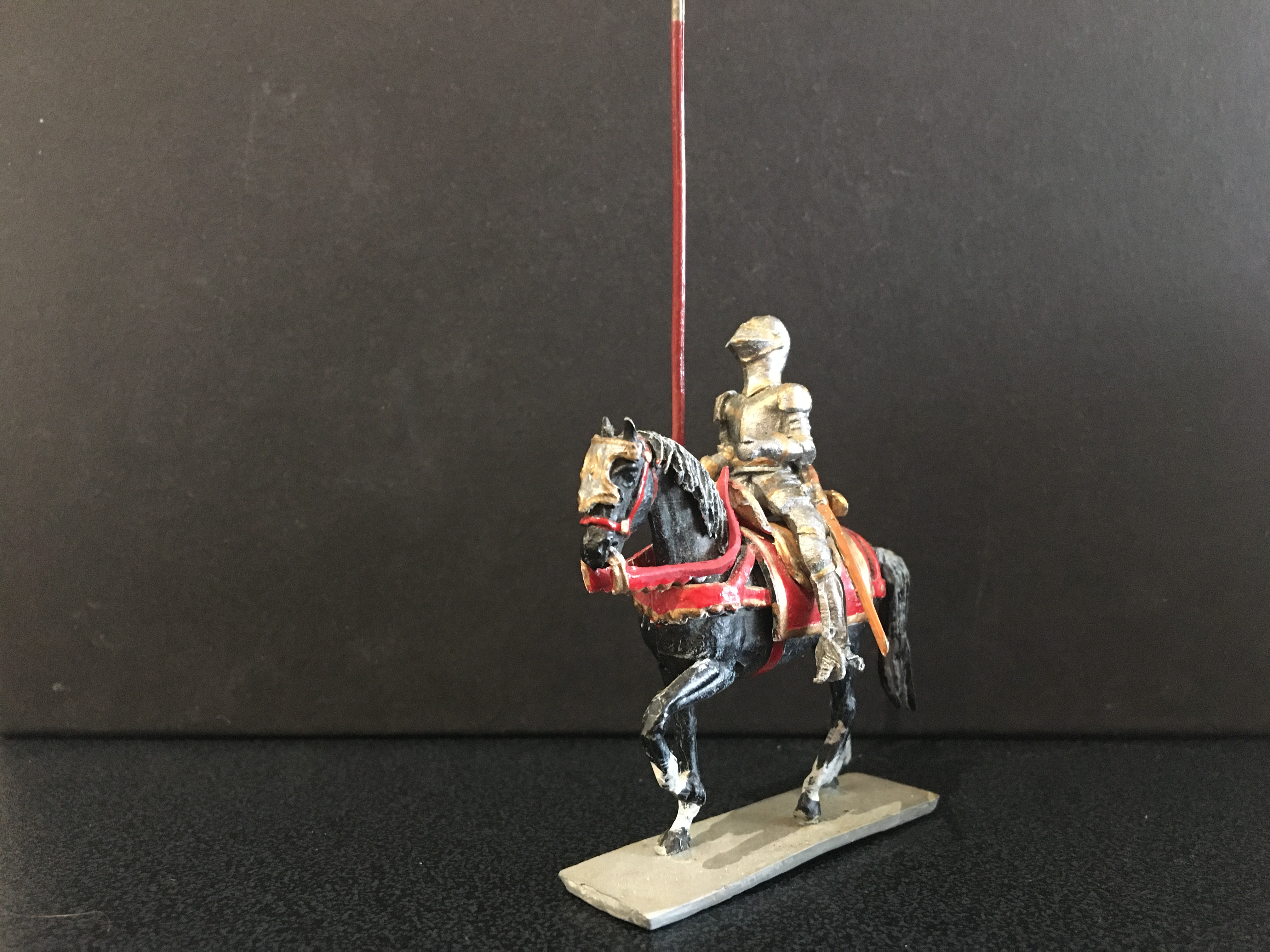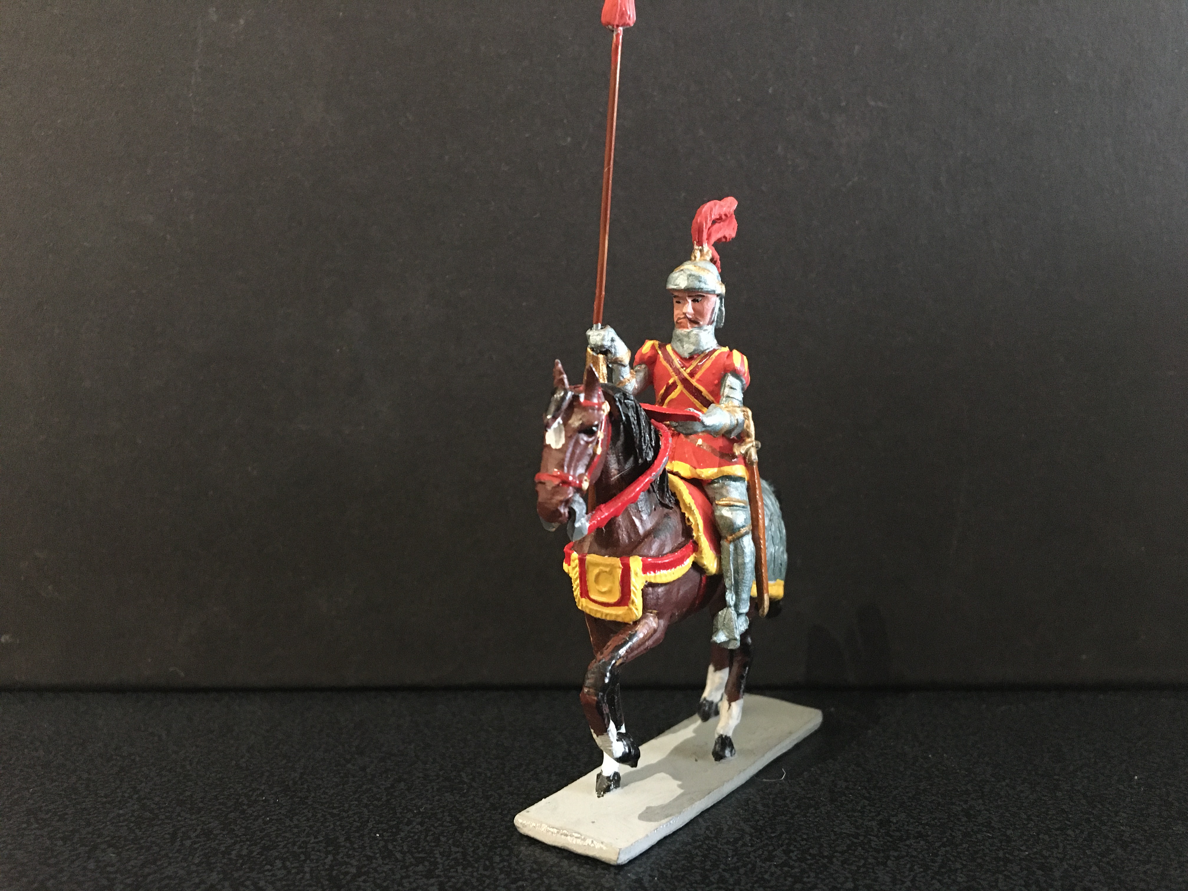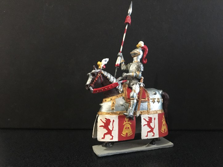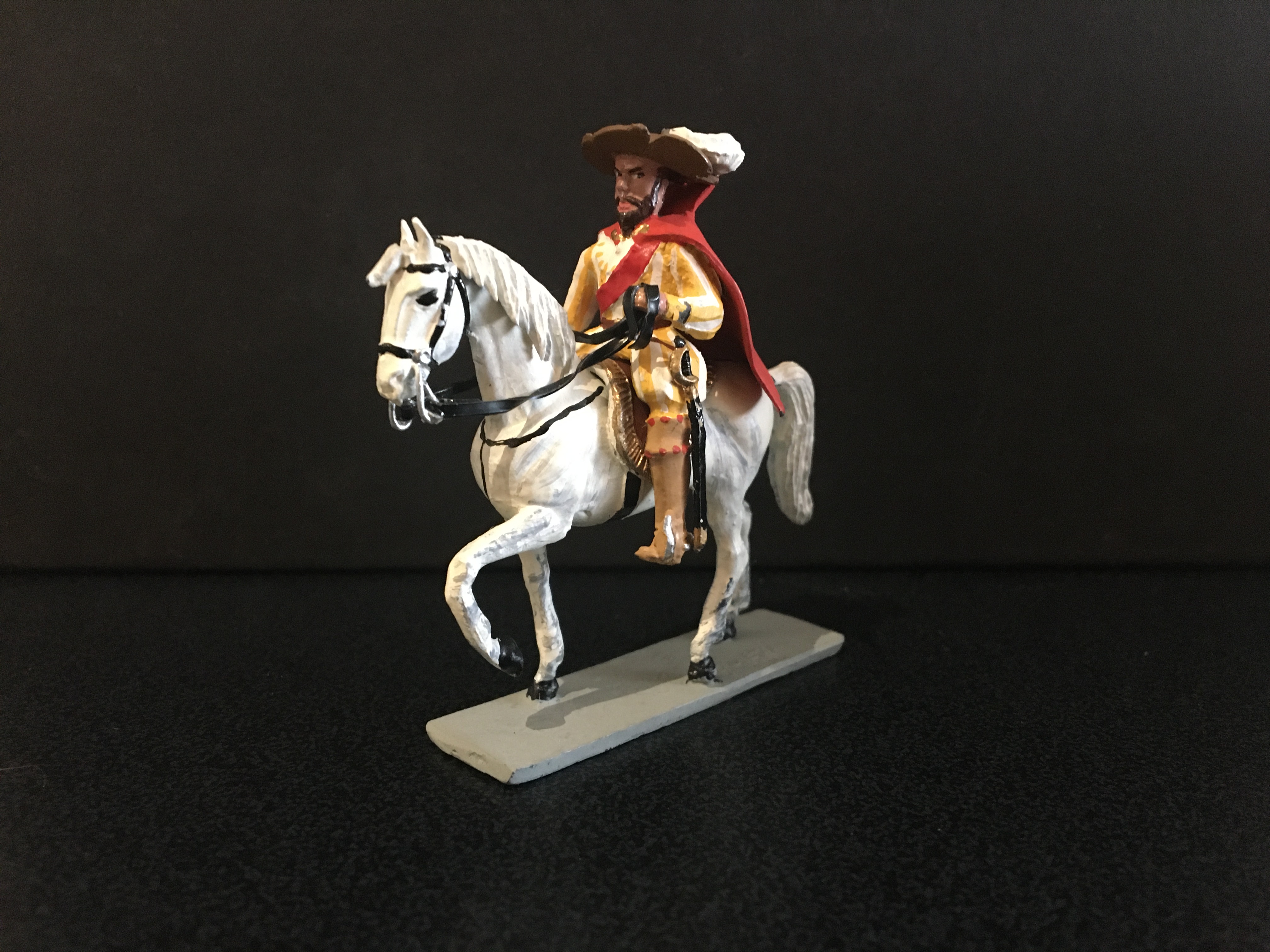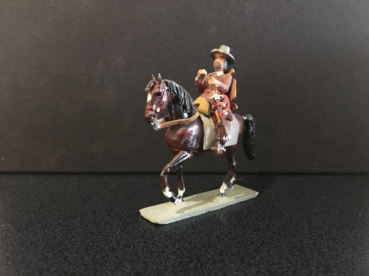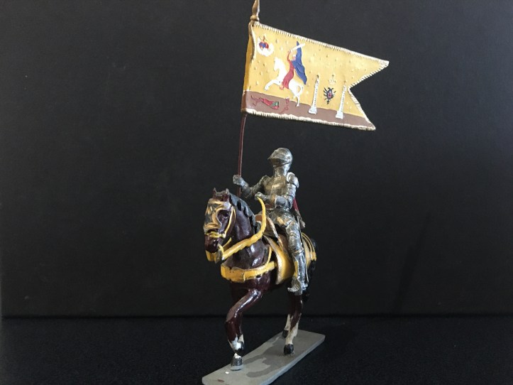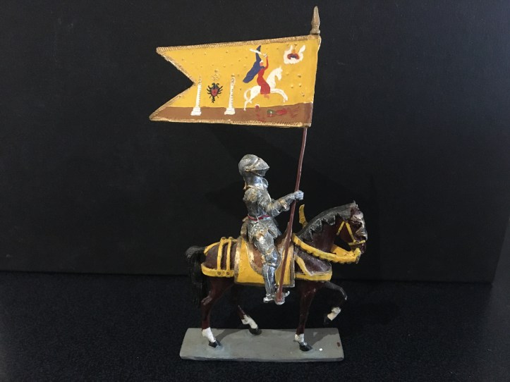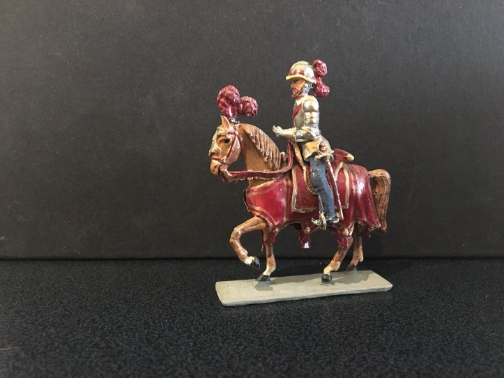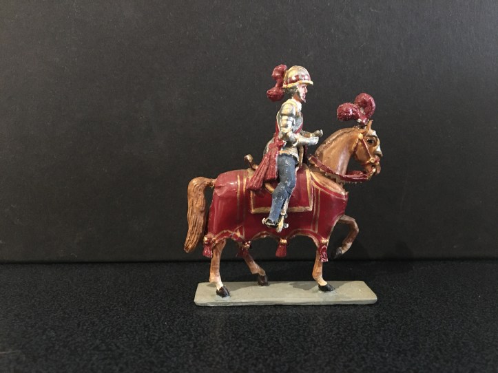 This is the second post dedicated to this range of figures. The first concentrated on the foot figures, now we have the mounted figures. Again, I am showing single examples of those I possess, there are many, many more I haven’t managed to collect yet. Sanquez has used a single horse casting for all these figures and soldered all the separate trappings and harness to depict the different types. The lead reins were always a weak spot; being heavy and often loose, for the mounted Landsknecht officer this has been replaced by a better thinner one. This has been done by the maker; I bought it mint in box and it may be of late production. A great deal of work that has gone into making the knight with full heraldic trappings. So let’s start with the Holy Roman Emperor himself; Carlos V. Haughty and successful, as were his armies; colourful, brimming with confidence.