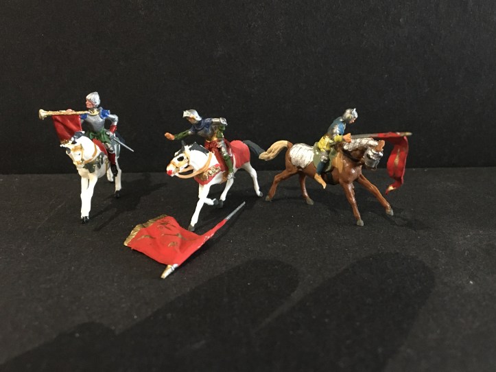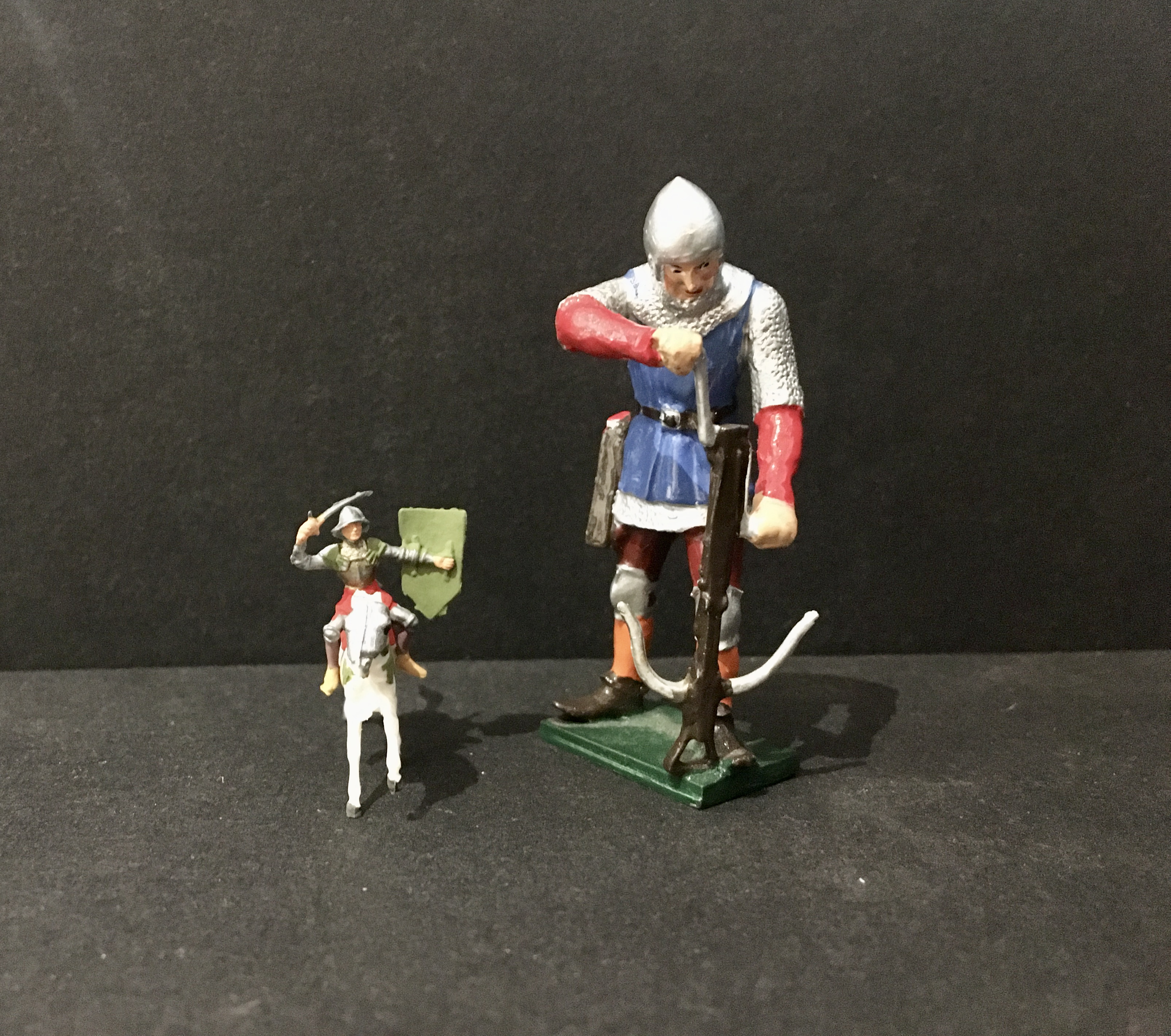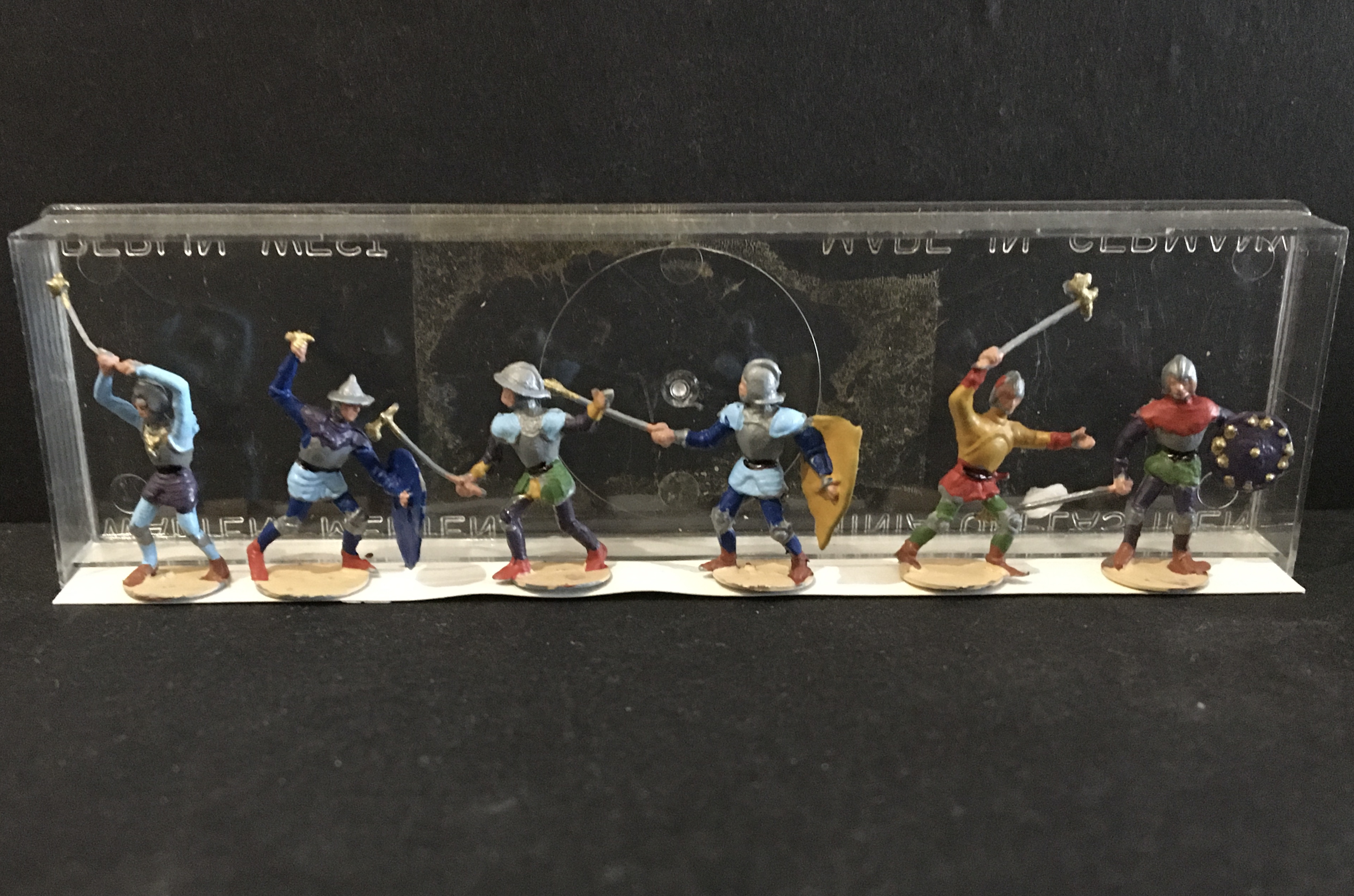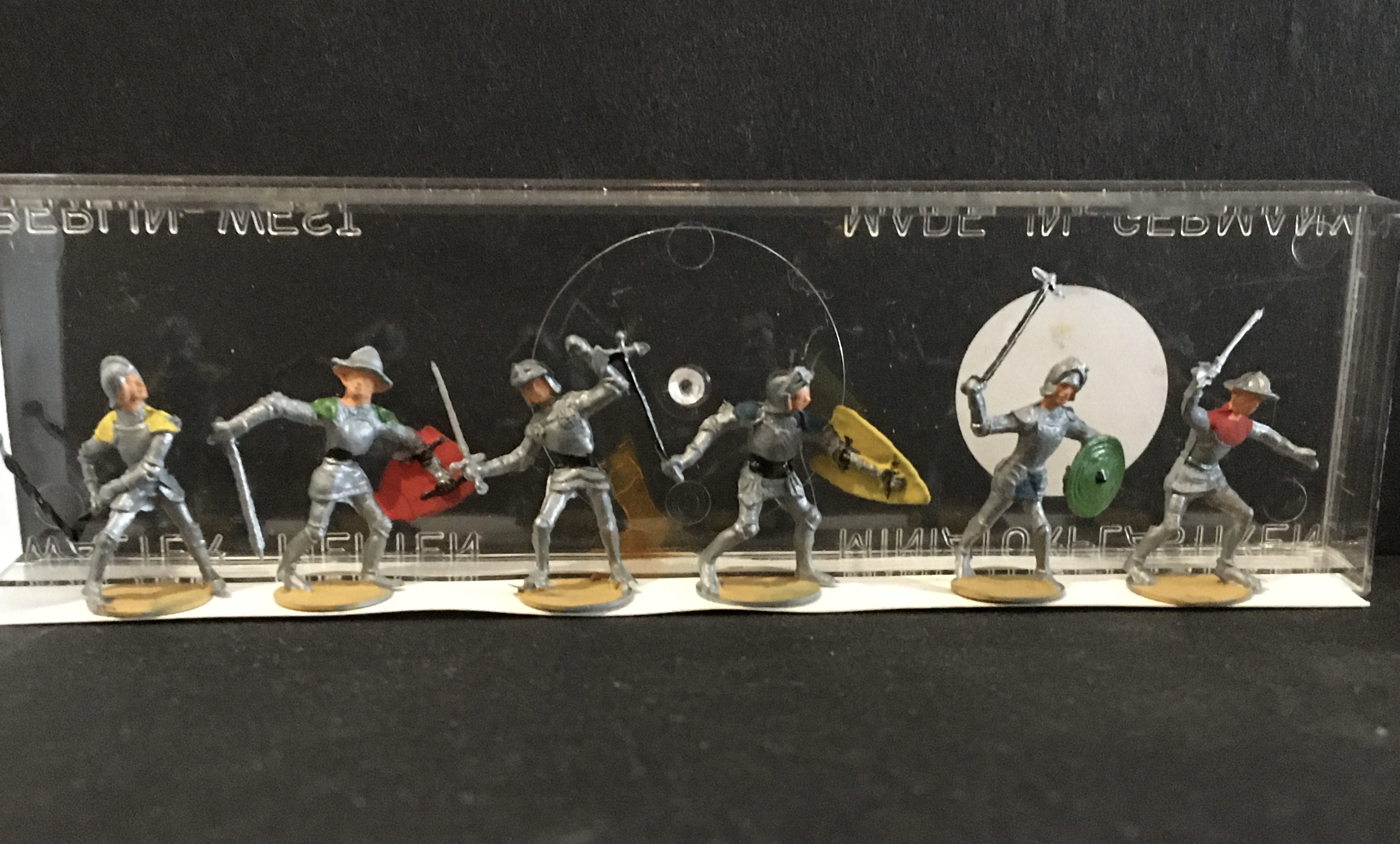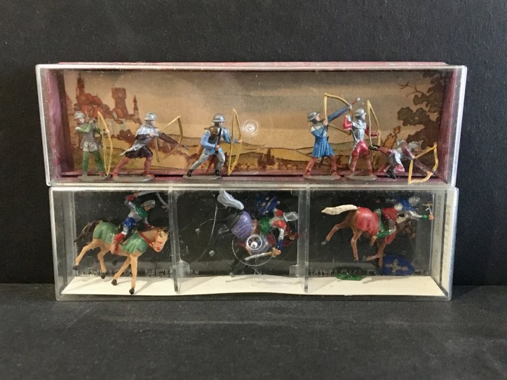 As a miniaturist, I am fascinated by these small, very delicate, hard plastic figures that were always sold factory painted in groups of six foot, or three mounted figures in plastic transparent boxes; the earlier ones with scenic backdrops. Beautifully action posed, they depict combatants of a late medieval battlefield or siege. Sadly, unlike the similar 40mm range, no siege equipment was made for them. Happily, I’ve collected a good number of these sets and one day will make a display with a suitable ‘Faller’ or similar German castle.