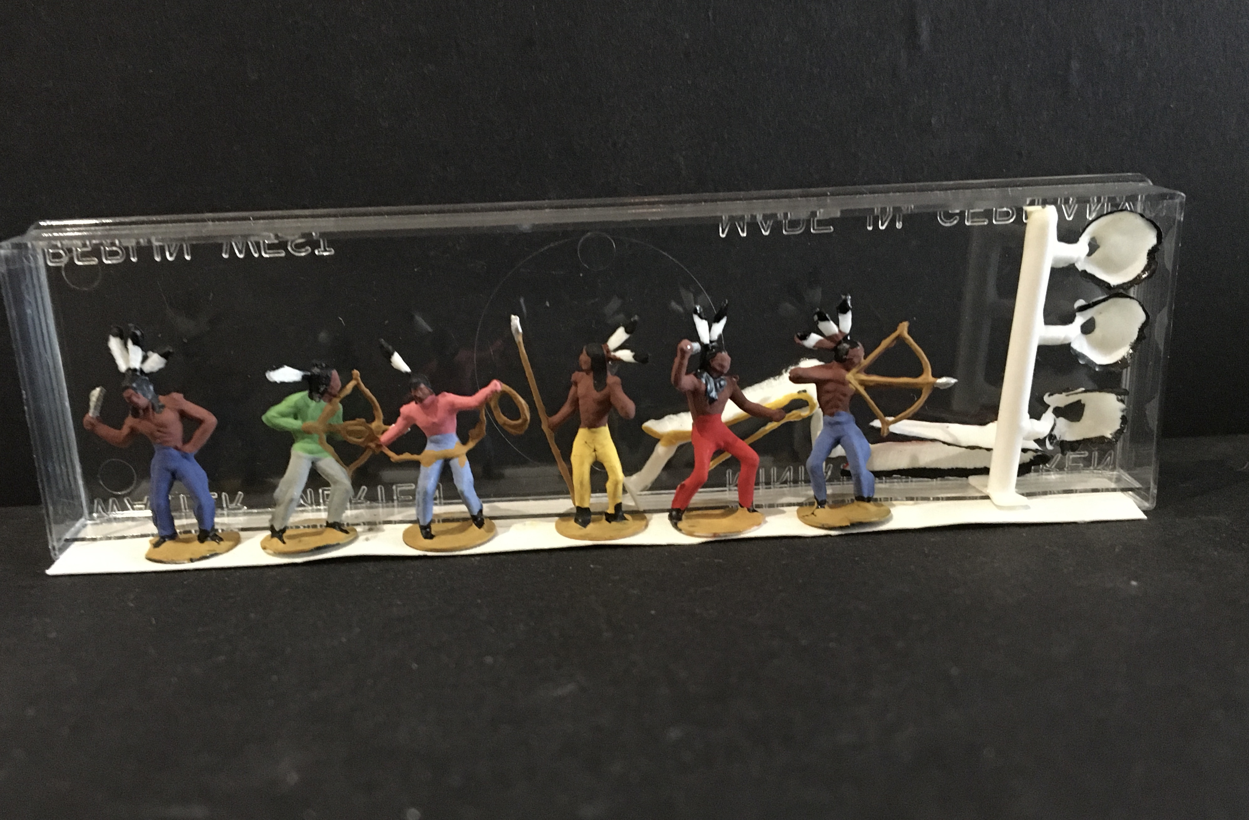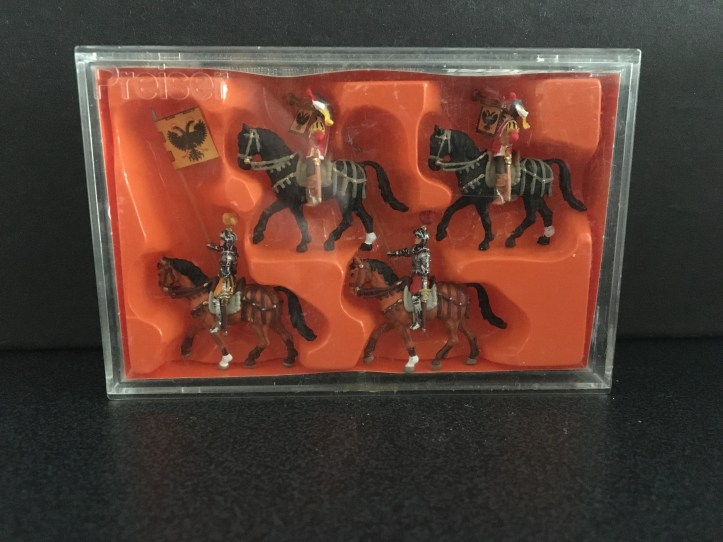 Below, because I’ve mentioned them, a box of wild west indians (native americans). Note the extra larger head-dresses that can be glued on the figures in place of the simpler feathers. And finally an example of the very limited HO historical sets that Preiser issued. They are standard Elastolin types, resized to HO, these their mounted Landsknechts. Elastolin never issued them in this size, and they are splendid. Every now and again they issue other historical figures and sets miniaturised from the Elastolin range.