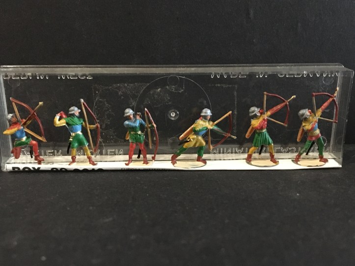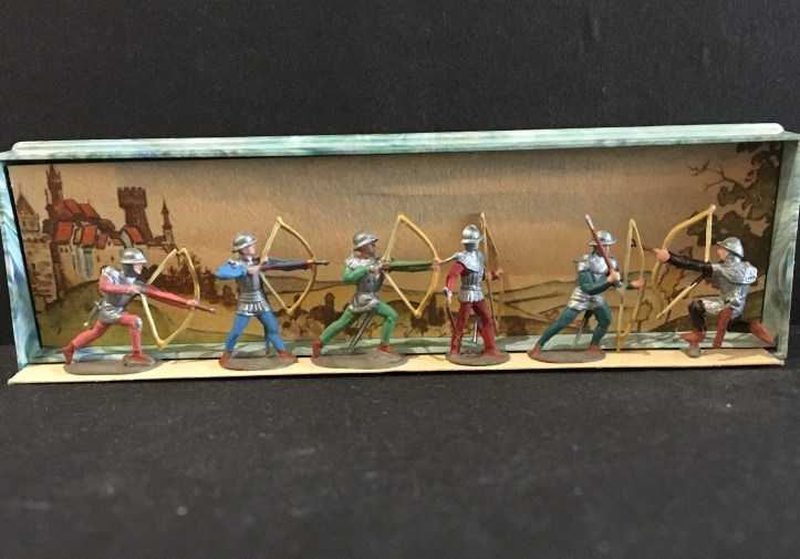 On the right is a 54mm medieval figure next to a mounted Merten knight, to demonstrate the size and delicate modeling of these figures. Underneath are a couple of boxed sets, the archers are in an older box with the backdrop, the knights in a later one. the compartments in the knight’s box can be adjusted to suite the contents. Click once on each image to enlarge and see the detail on these tiny figures.