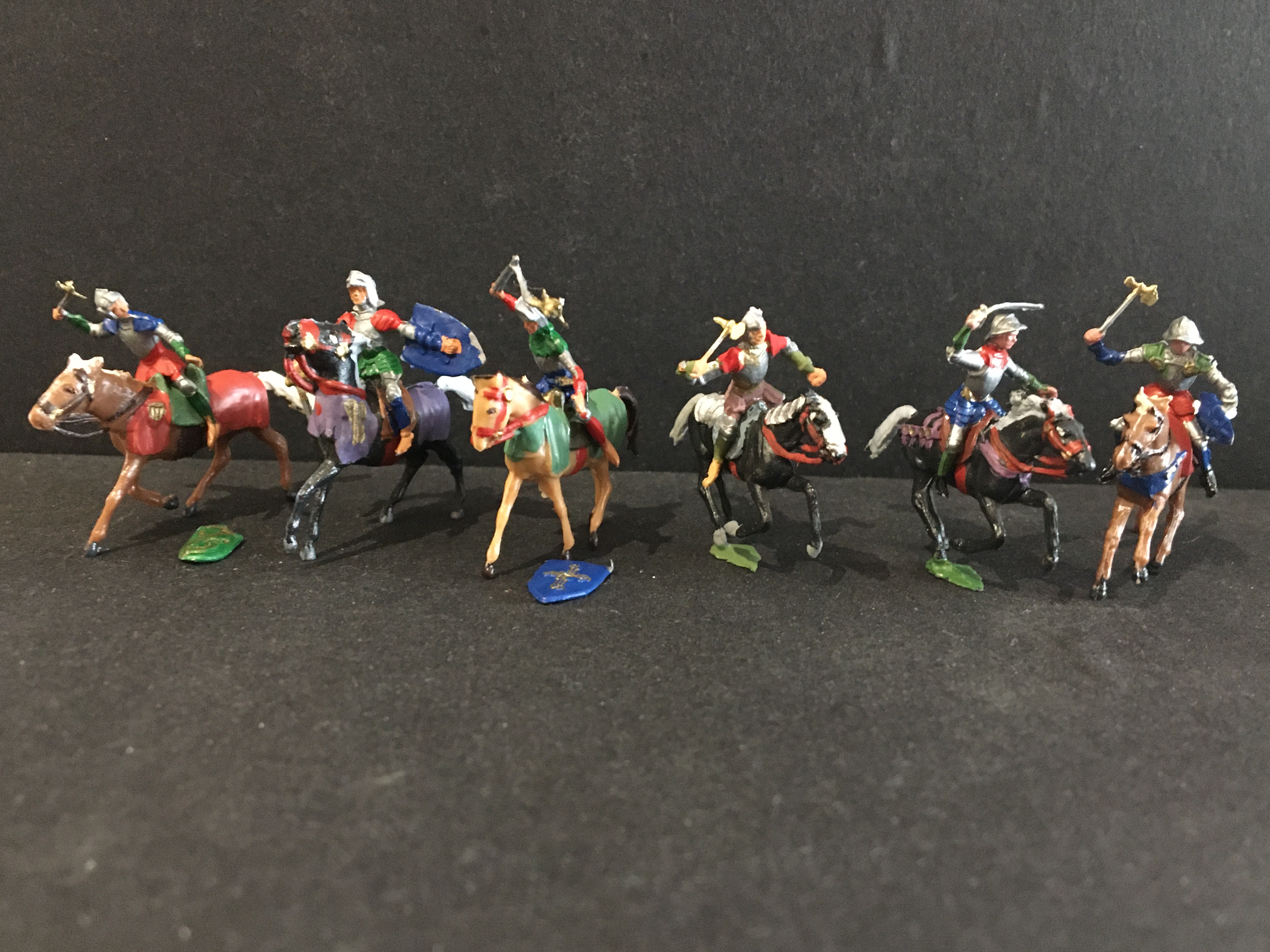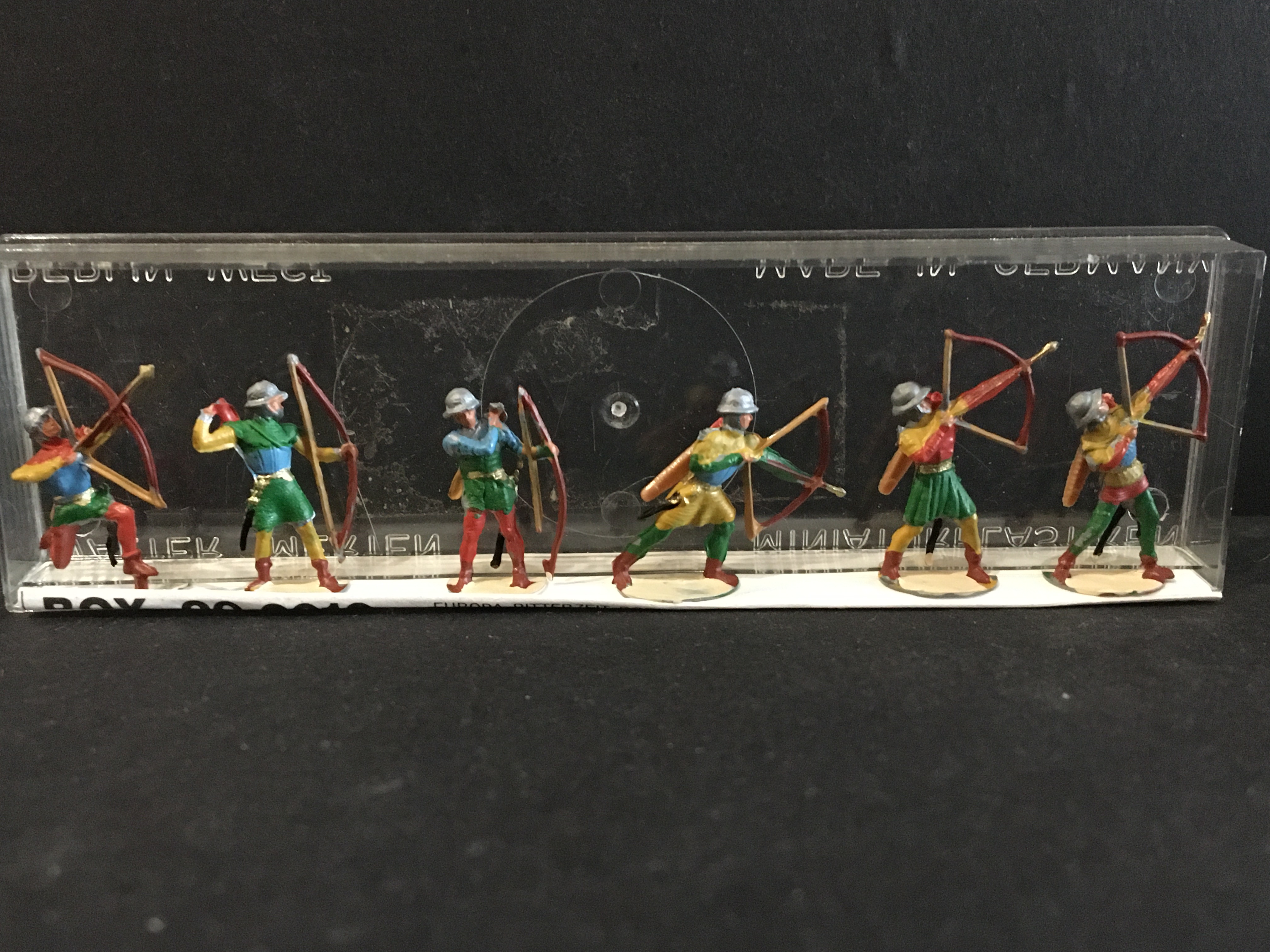 I am not sure what the market was for these figures, the other figures in the catalogue were civilian figures that would be used to enhance railway layouts of the late Victorian or 20th century eras. Maybe the cowboys and indians could possibly be used for a period layout, but it would take quite an imaginative senario to fit medieval figures in. They are too delicate and fiddly to play with, so I can only surmise that they were for dioramas. Below are a selection of the mounted knights, They are all as sold, any shields or flags not on the figures, needed to be glued on. Then come the archers, older and later boxes, showing how many different figures they made and different paint jobs. Then the foot knights, again so many different types.