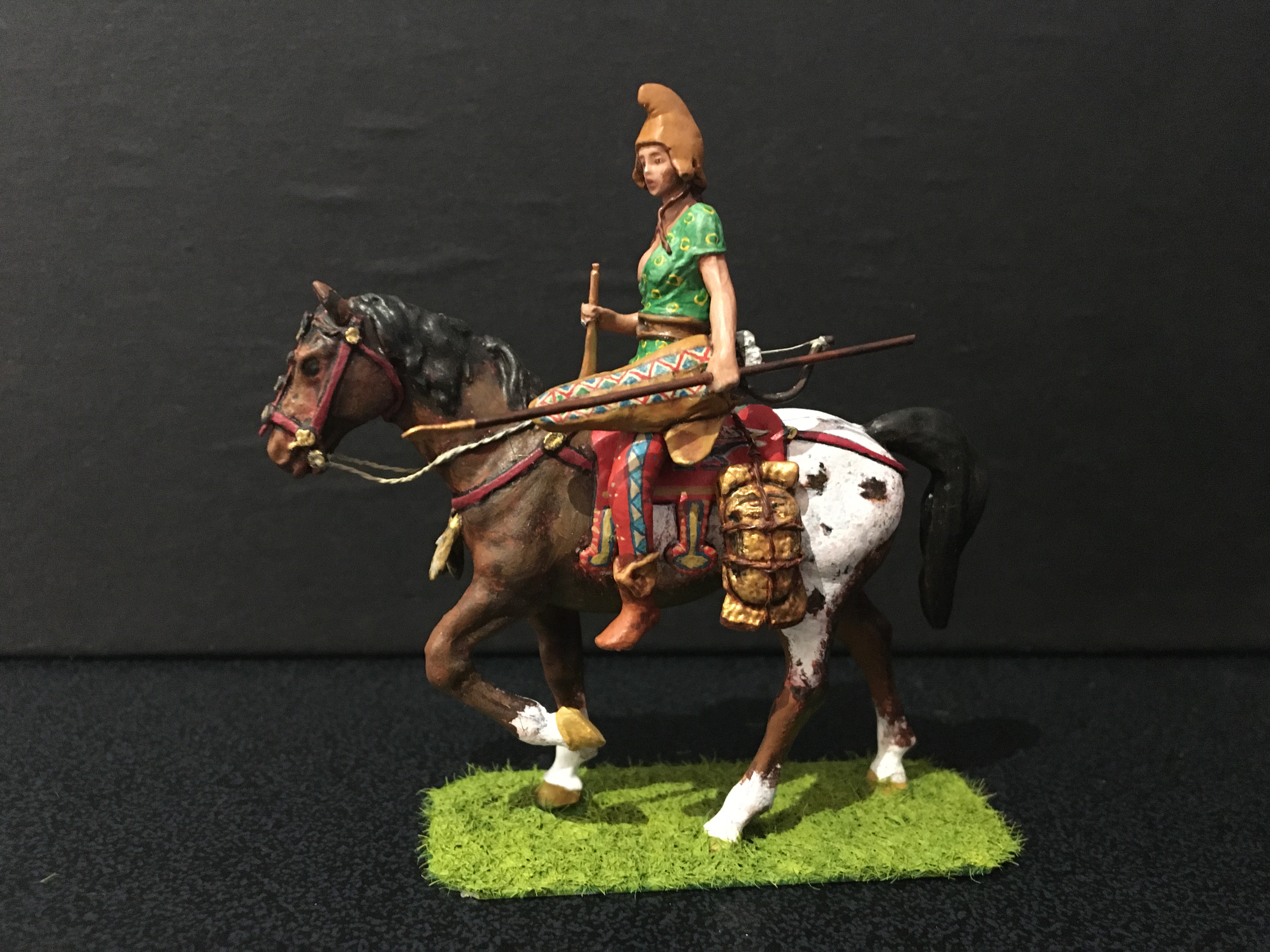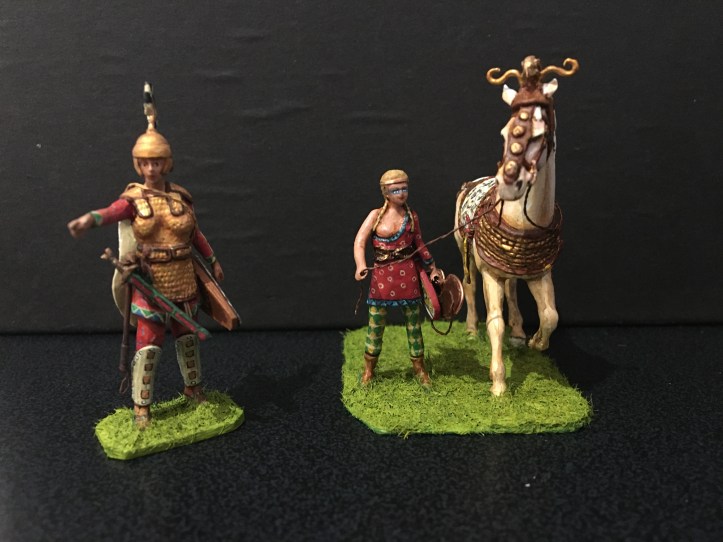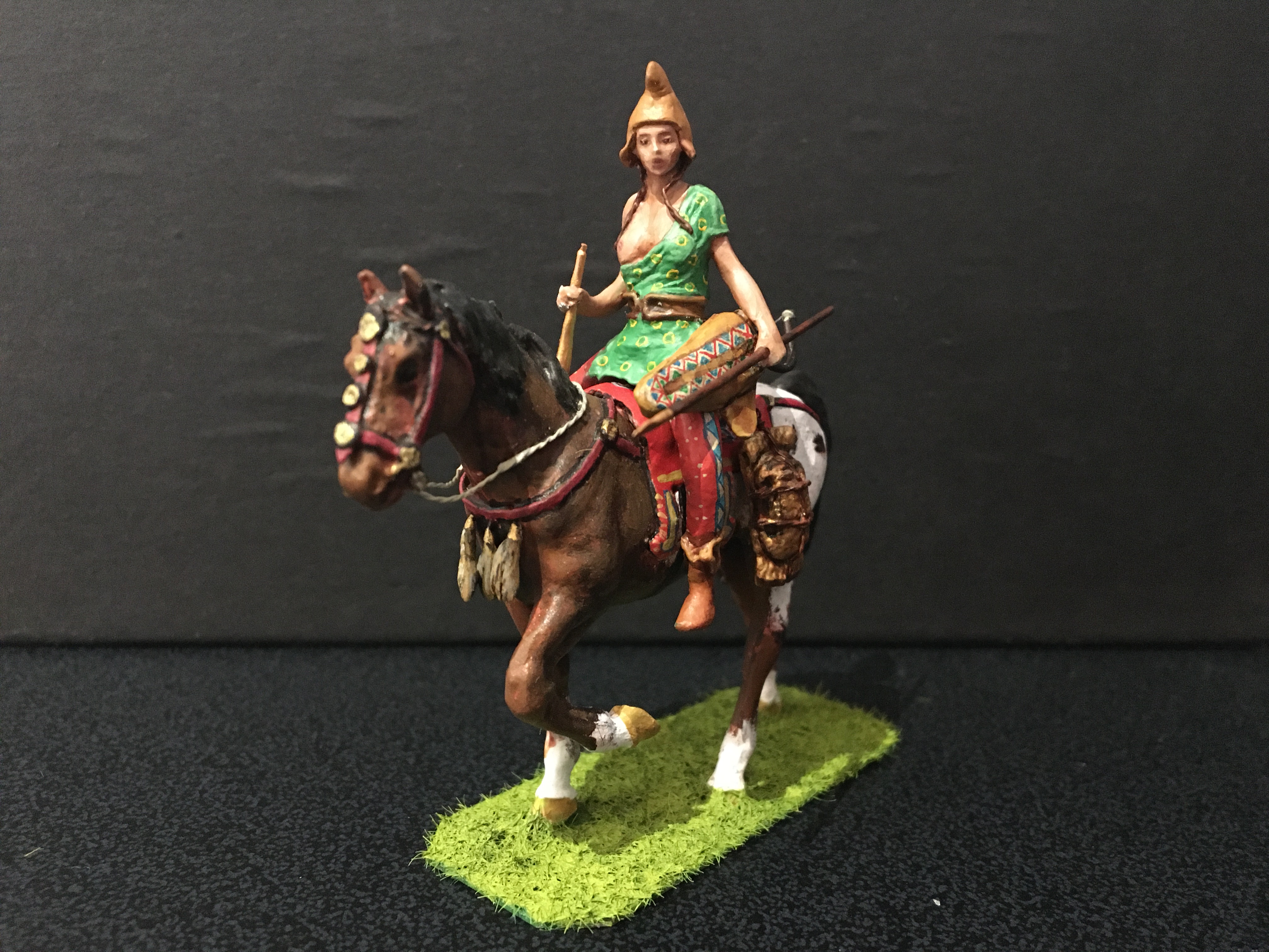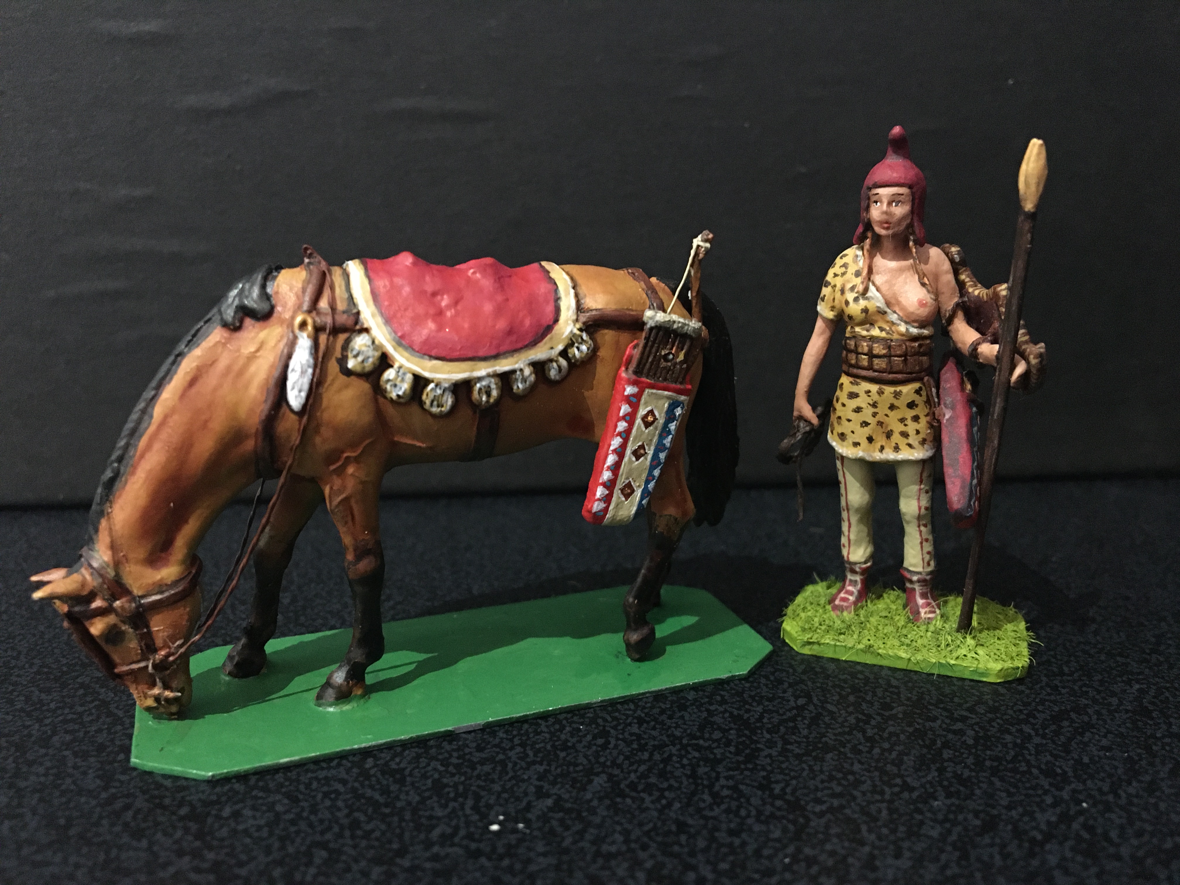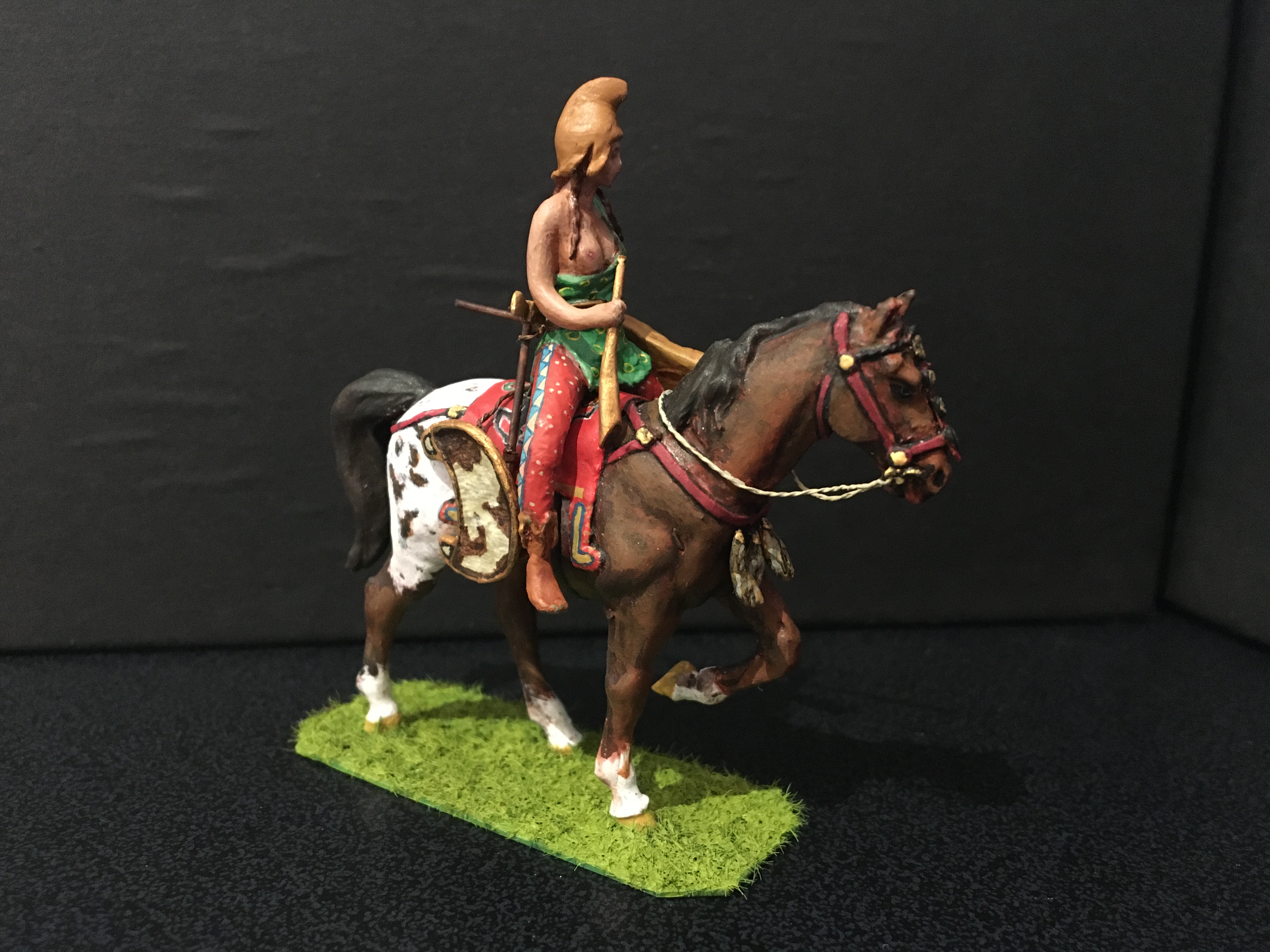 Below is my take on a group of Amazon warriors, shown individually, I’ve mixed archaeological evidence with myth, homage to stories such as that of Penthesilea during the Trojan war, depictions from classical Greece and archaeological evidence. They are scratch-built 50mm figures, made primarily of metal with other materials added. The horses are heavily converted from commercial, mostly resin kit figures. Many weapons are removable. It’s an ongoing project. For comparison the Stadden Greeks in image three are 54mm, commissioned as a primed piece from Norman Newton in 1970.