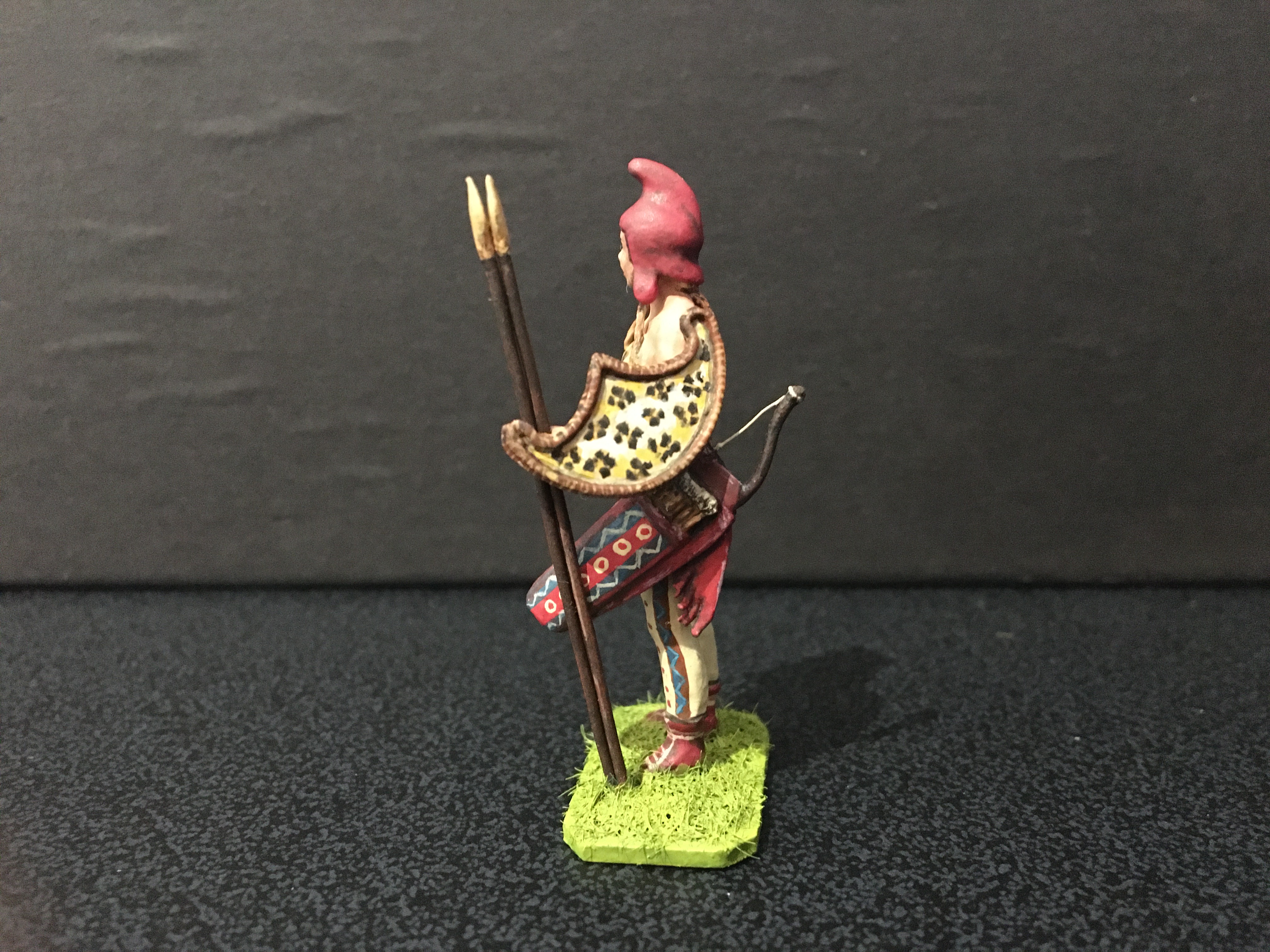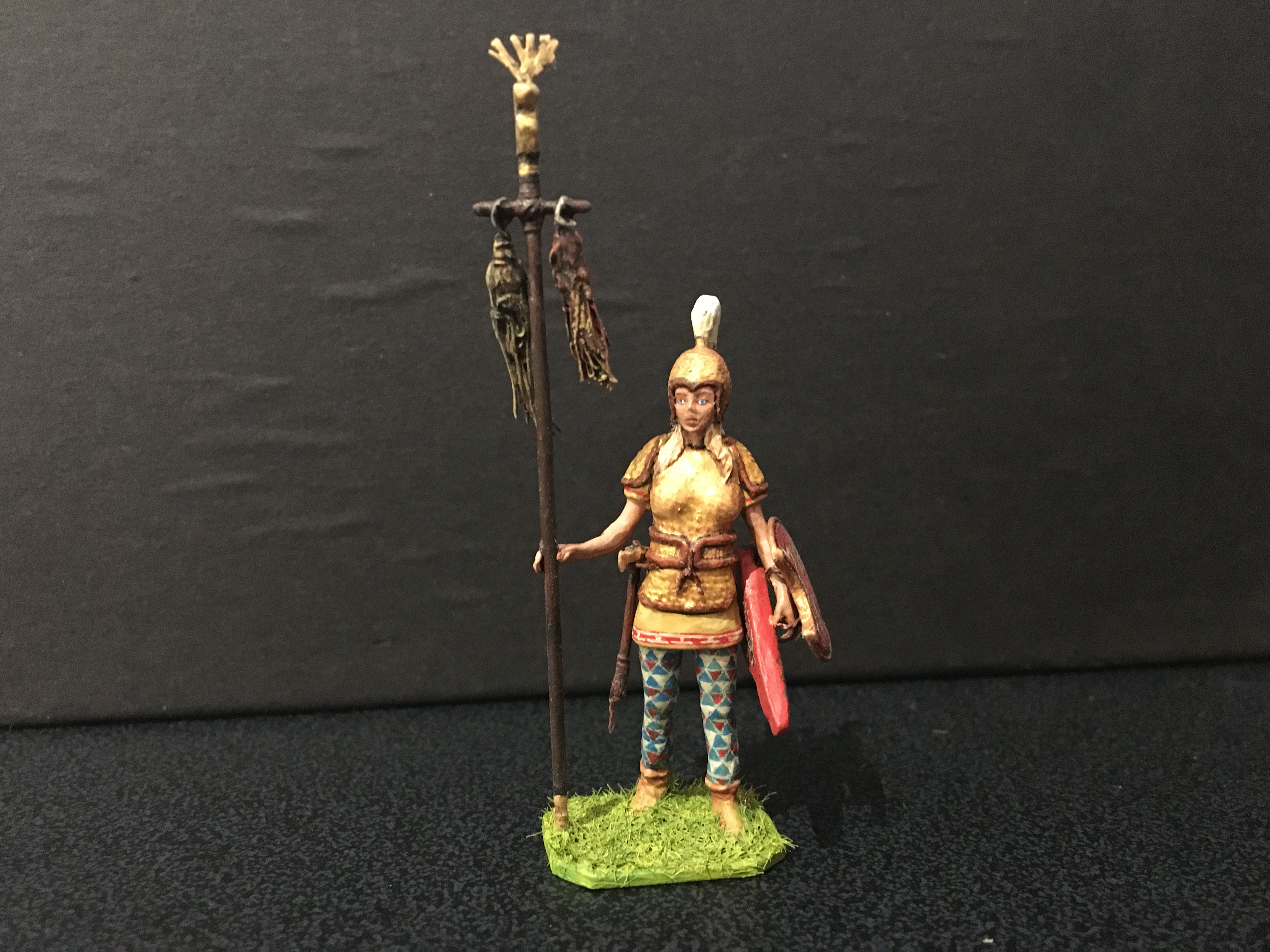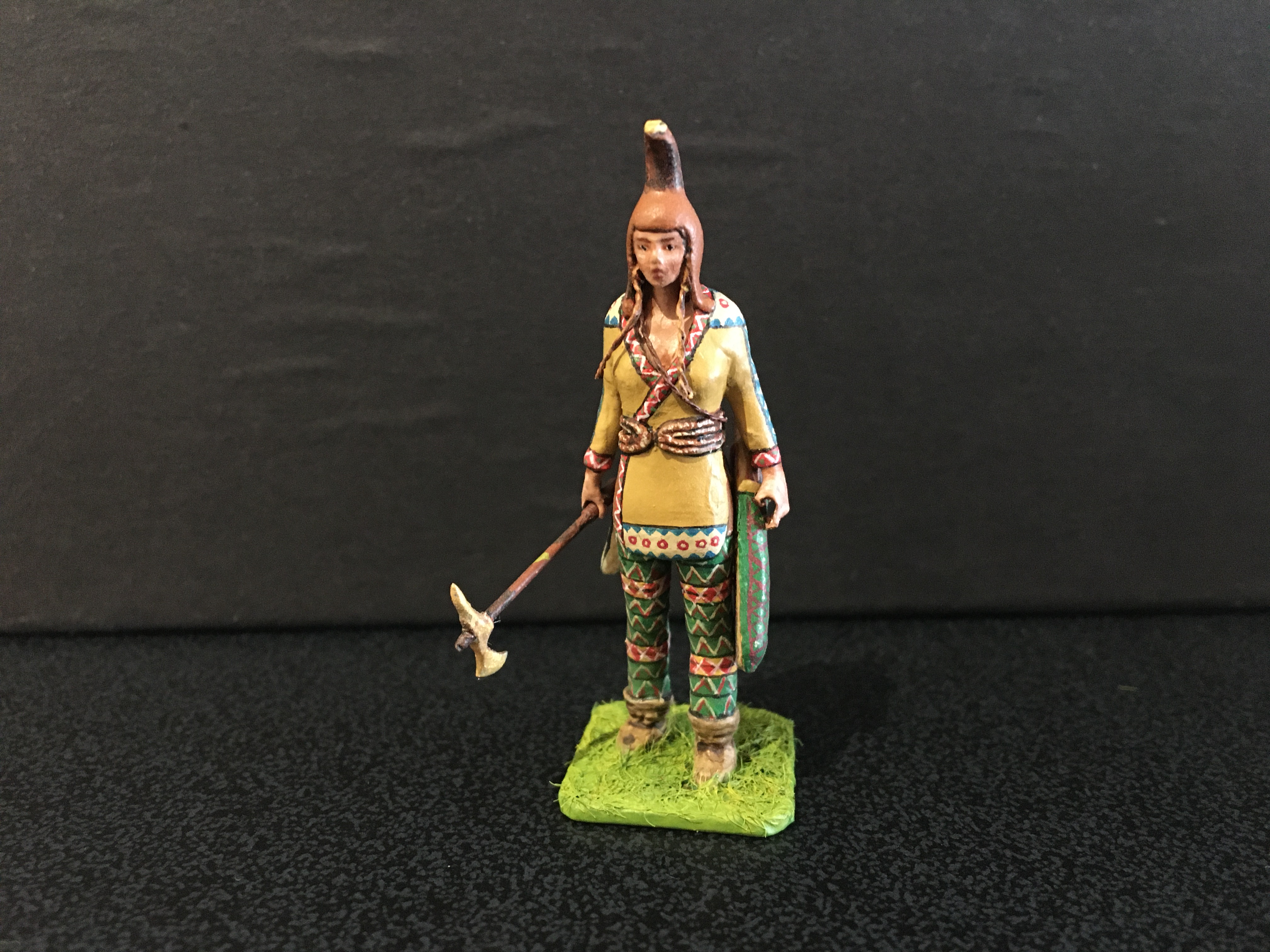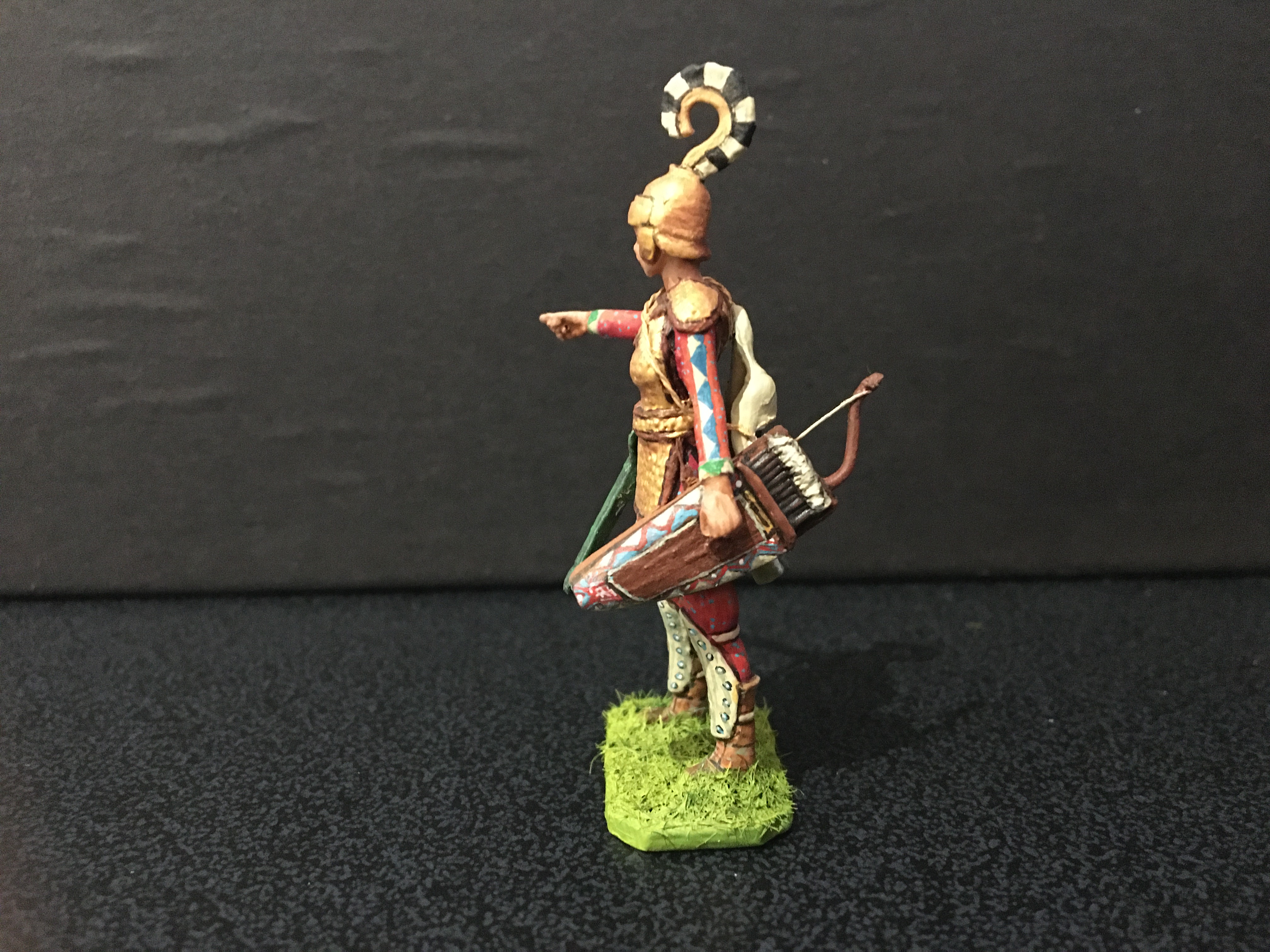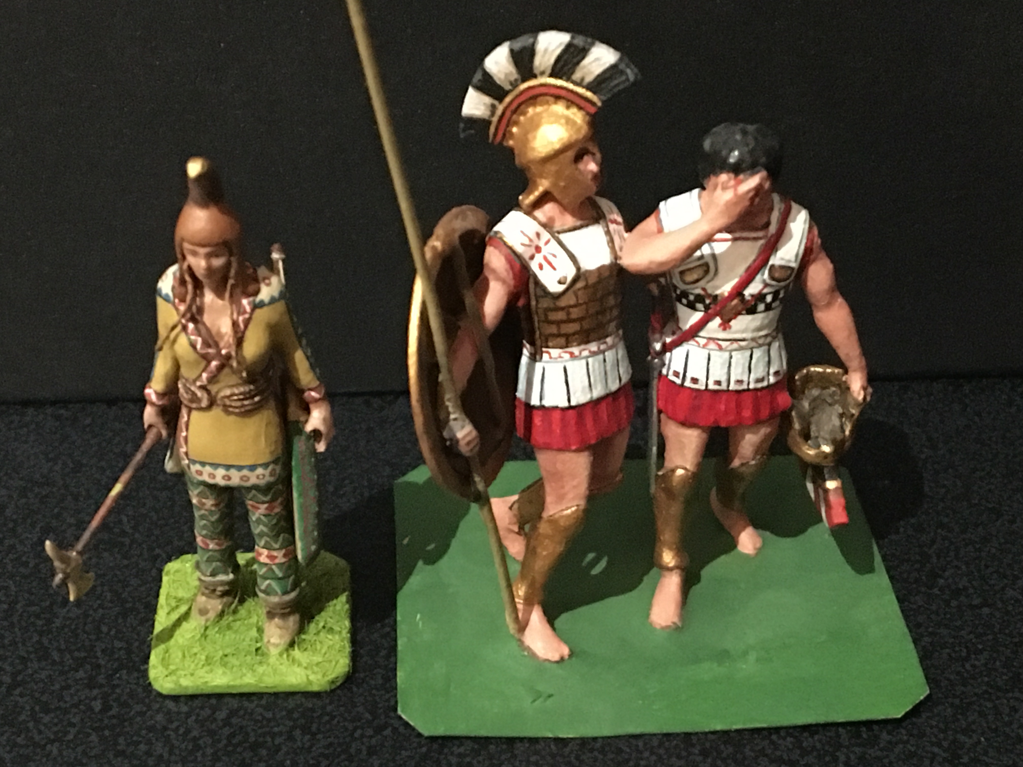 Below is my take on a group of Amazon warriors, shown individually, I’ve mixed archaeological evidence with myth, homage to stories such as that of Penthesilea during the Trojan war, depictions from classical Greece and archaeological evidence. They are scratch-built 50mm figures, made primarily of metal with other materials added. The horses are heavily converted from commercial, mostly resin kit figures. Many weapons are removable. It’s an ongoing project. For comparison the Stadden Greeks in image three are 54mm, commissioned as a primed piece from Norman Newton in 1970.