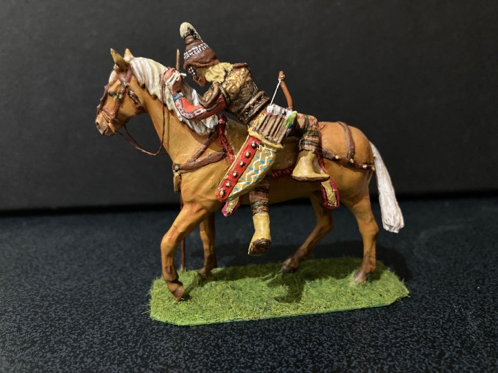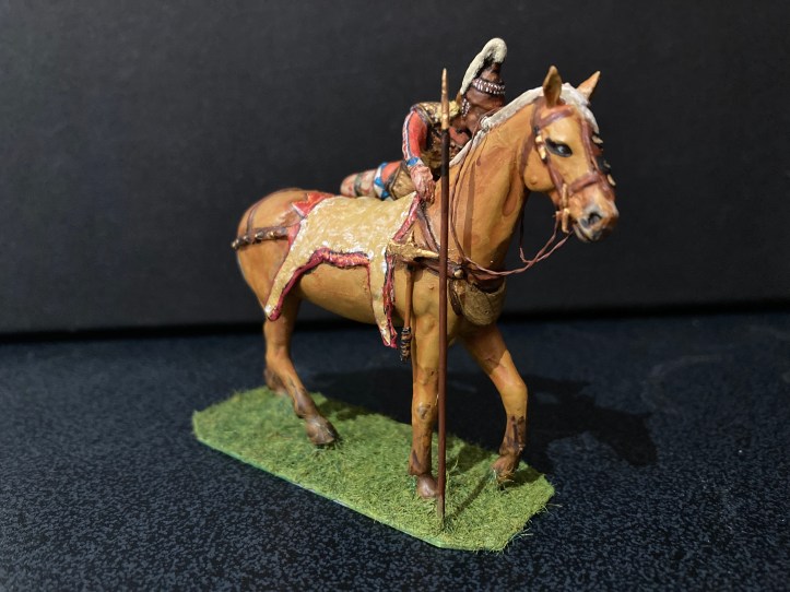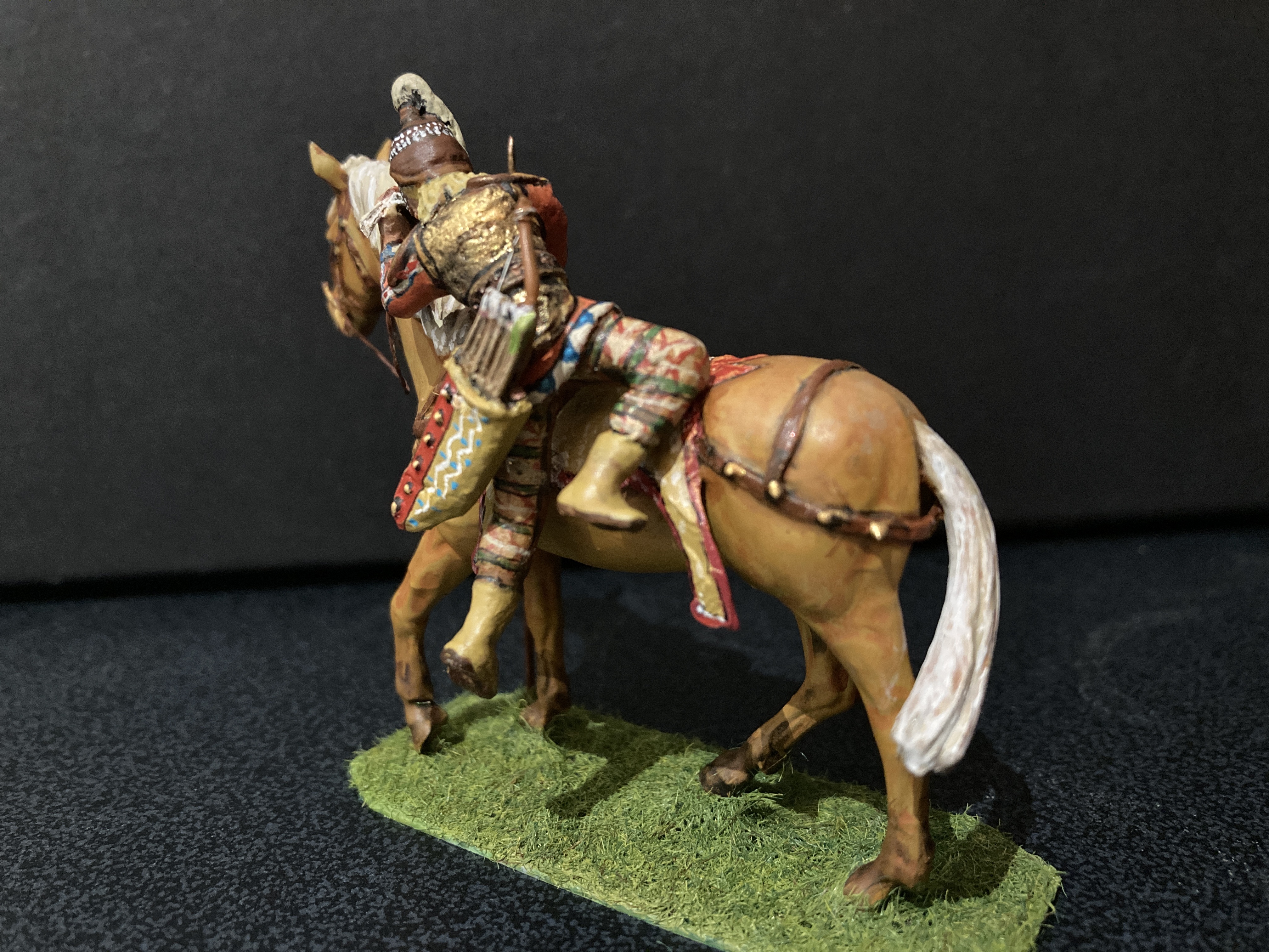 This figure is an ambitious model of a warrior mounting her horse. the horse furniture is rudimentary and based mostly on historical evidence with a bit of artistic interpretation. The tackle is based on known examples and she is using method that even now riders use to mount bareback without stirrups; grabbing a clump of mane to gain leverage onto the horse. Her clothing and armour are a mix of Mycenaean and Scythian; this keeps to my vision but perhaps not that of those who impart absolutes to their historical research. I believe that we never know exactly what happened in the past, because we weren’t there, and the further we go back, the more that applies. As a writer and a dreamer I’m comfortable with this. Oh, and a collector of toy soldiers.