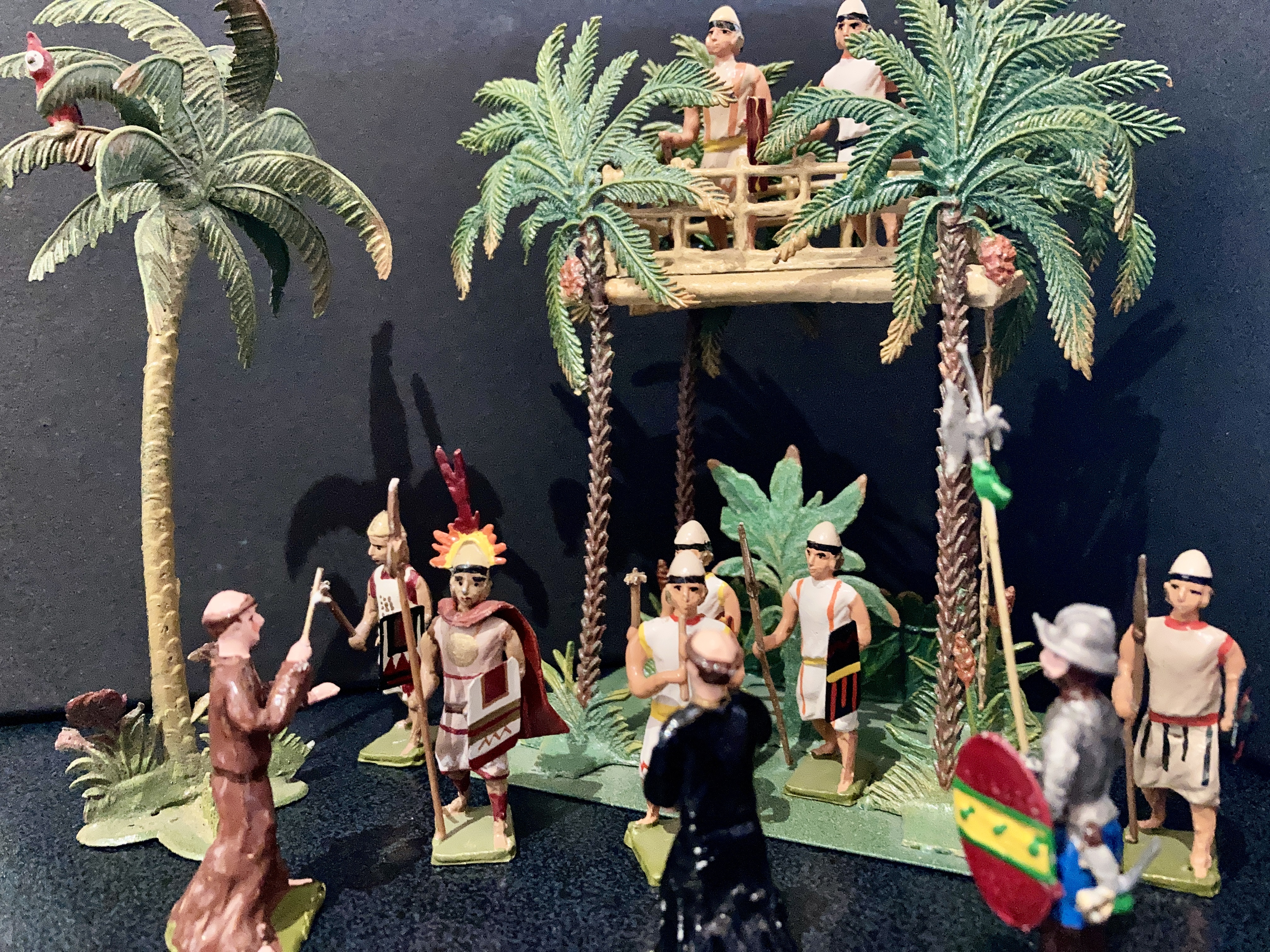 I’m still looking to expand this collection, especially more Inca’s and other indigenous warriors I know Joe made, and of course more of his charming accessories like those in the photo’s; the three-dimensional palm tree, with its little parrot is super, as is the larger set piece; also used for tiger hunts and other jungle sets. There is also a set piece of an Aztec lord being carried by his native bearers: Wonderful, I’ll find it one day.