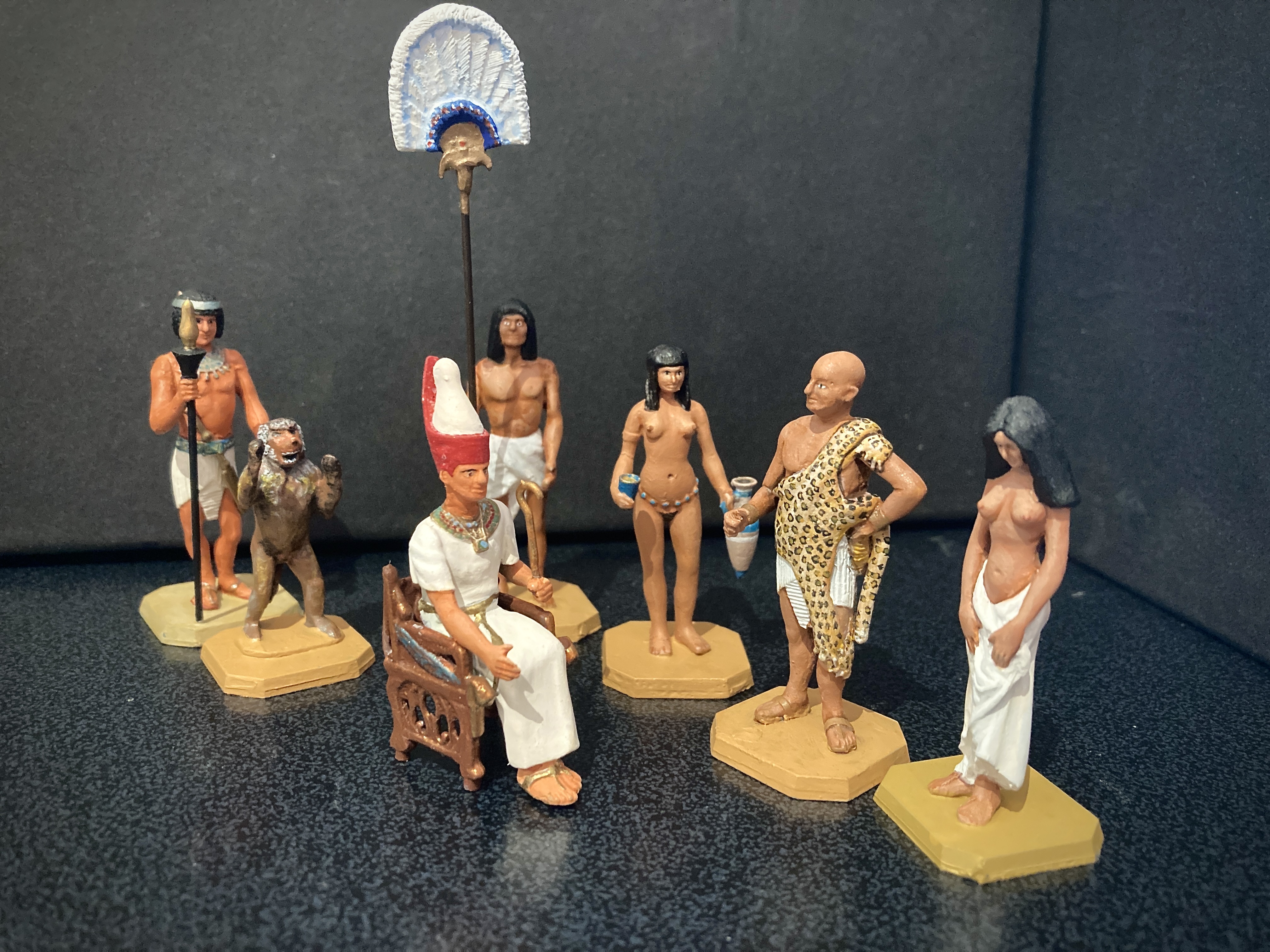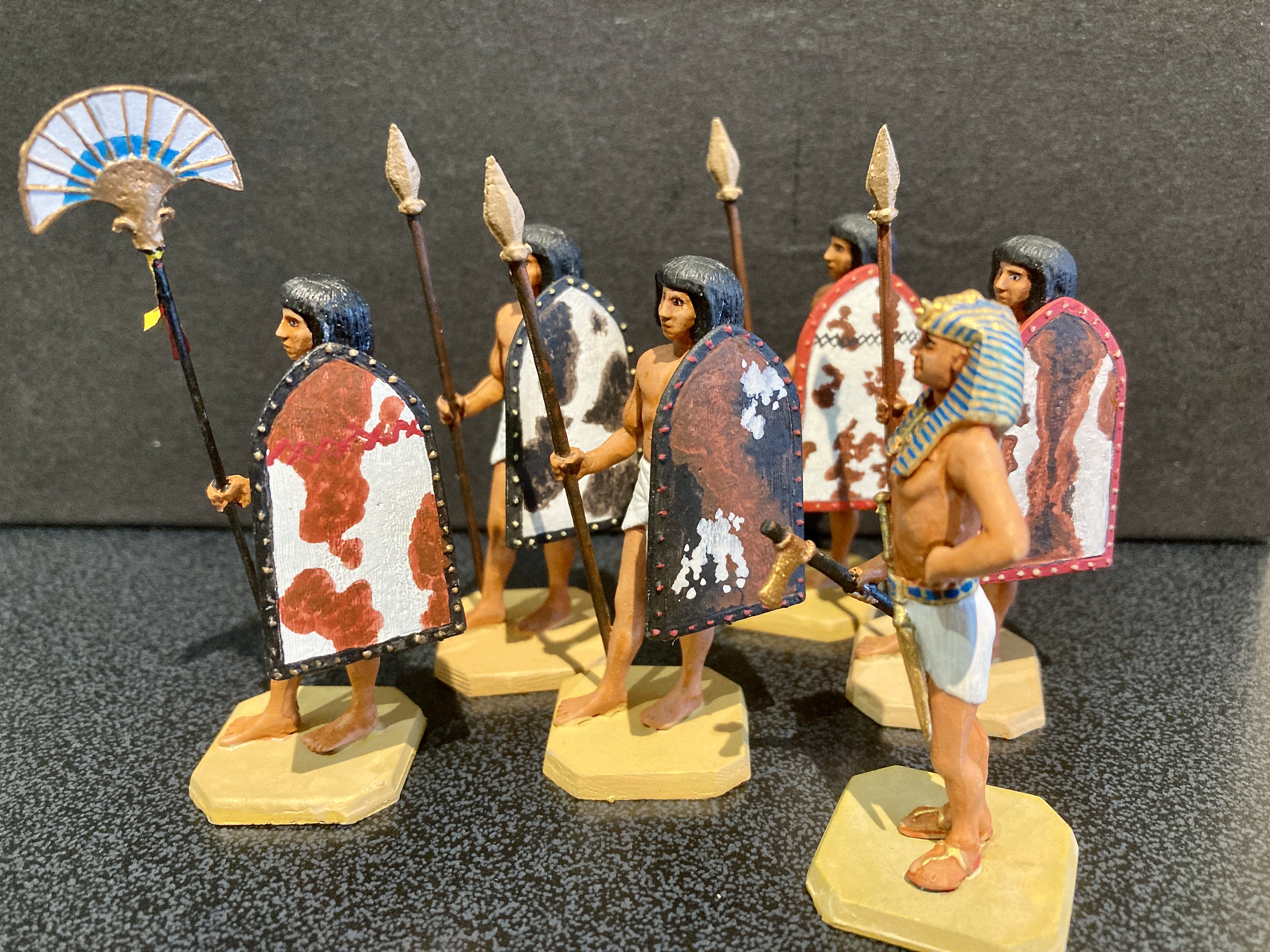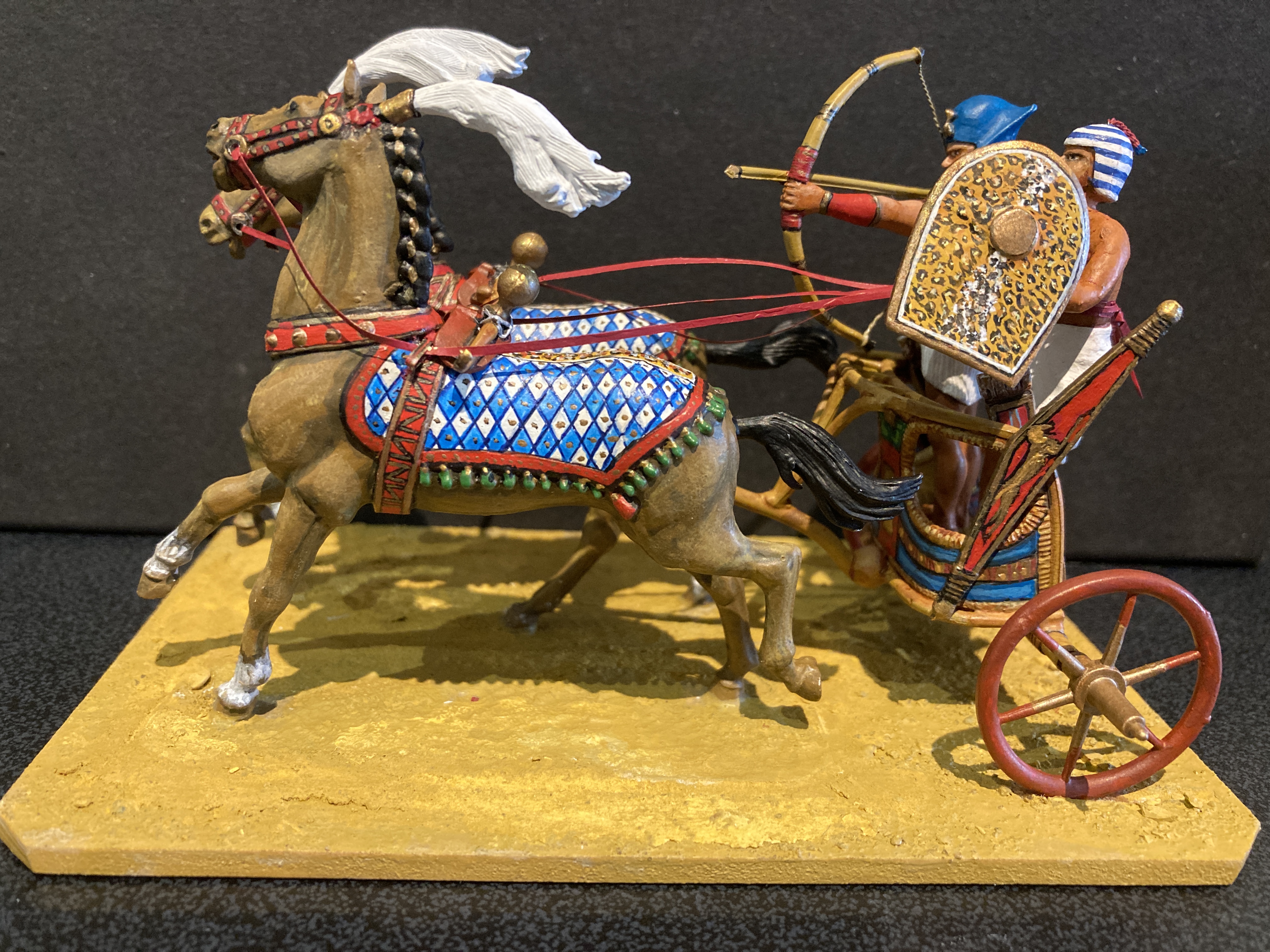 Rose Miniatures, sculpted by Russell Gammage were originally sold in kit form or ready painted. Later they were sold by other manufacturers in one form or another and still are. My own interest is in collecting and painting the original castings, particularly the Ancient Egyptian range. Because they were sculpted as metal kit figures and a number of extra heads, even wigs and other parts could be bought to accompany them, the figures could be made up as sold in individual ‘minipacks’ or customised. The first image I’m showing is the magnificent chariot set. It’s not easy to construct, needing a lot of care, but the finished product is worth the effort. Judge for yourself. My only addition to the original castings is the shield; just a personal thing.
