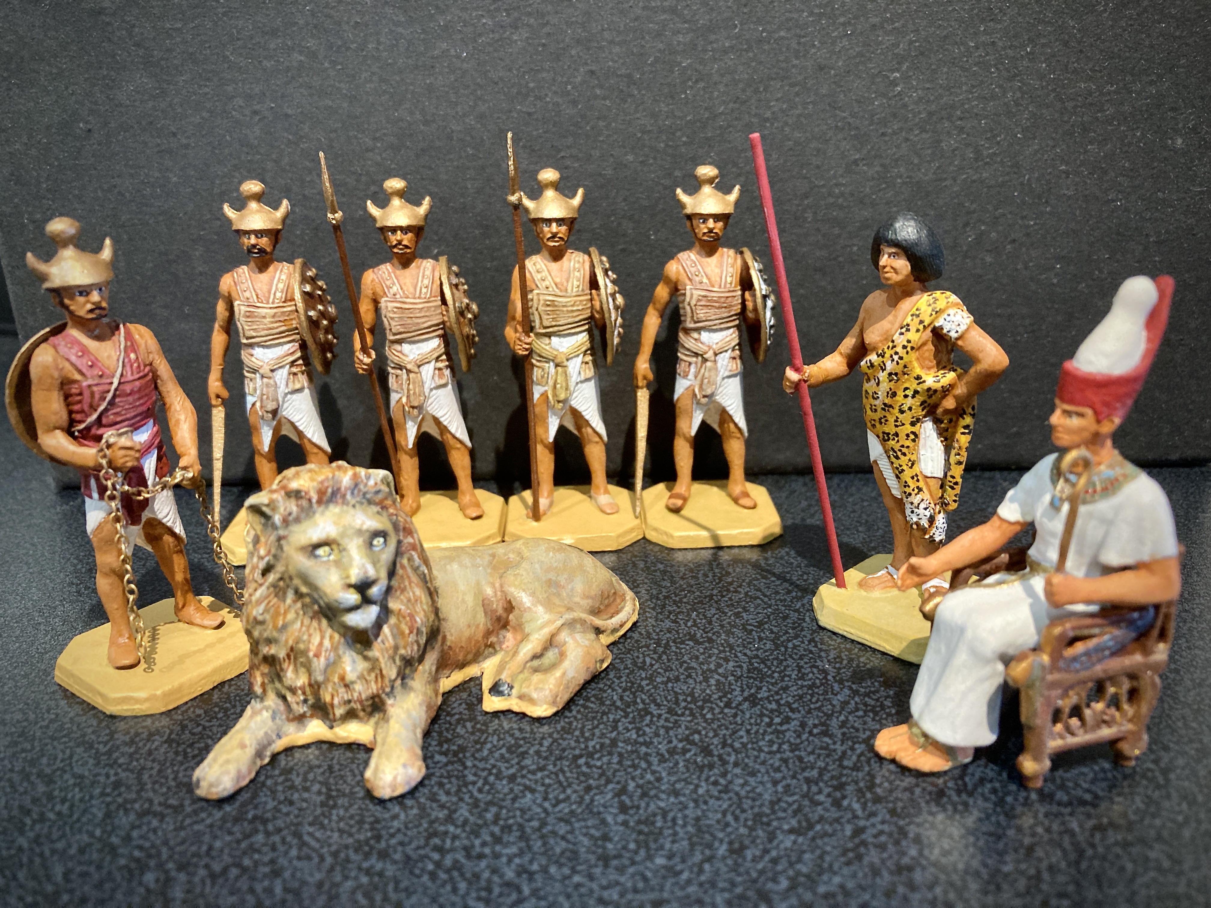 Here are more groups. The Pharaoh with his Sherden Guard, including a huge Barbary Lion, reputed to accompany him into battle and below this Egyptian infantry. These figures, whilst available as standard kits, could be converted using a variety of Rose spare arms and accessories. Whole scenes could be easily constructed. Factory painted figures were simple but accurate and this style of painting is still best suited to them. The Lion is not a Rose model but a hollowcast one I quite like. Click on any photo to enlarge. More to come from this beautiful range.