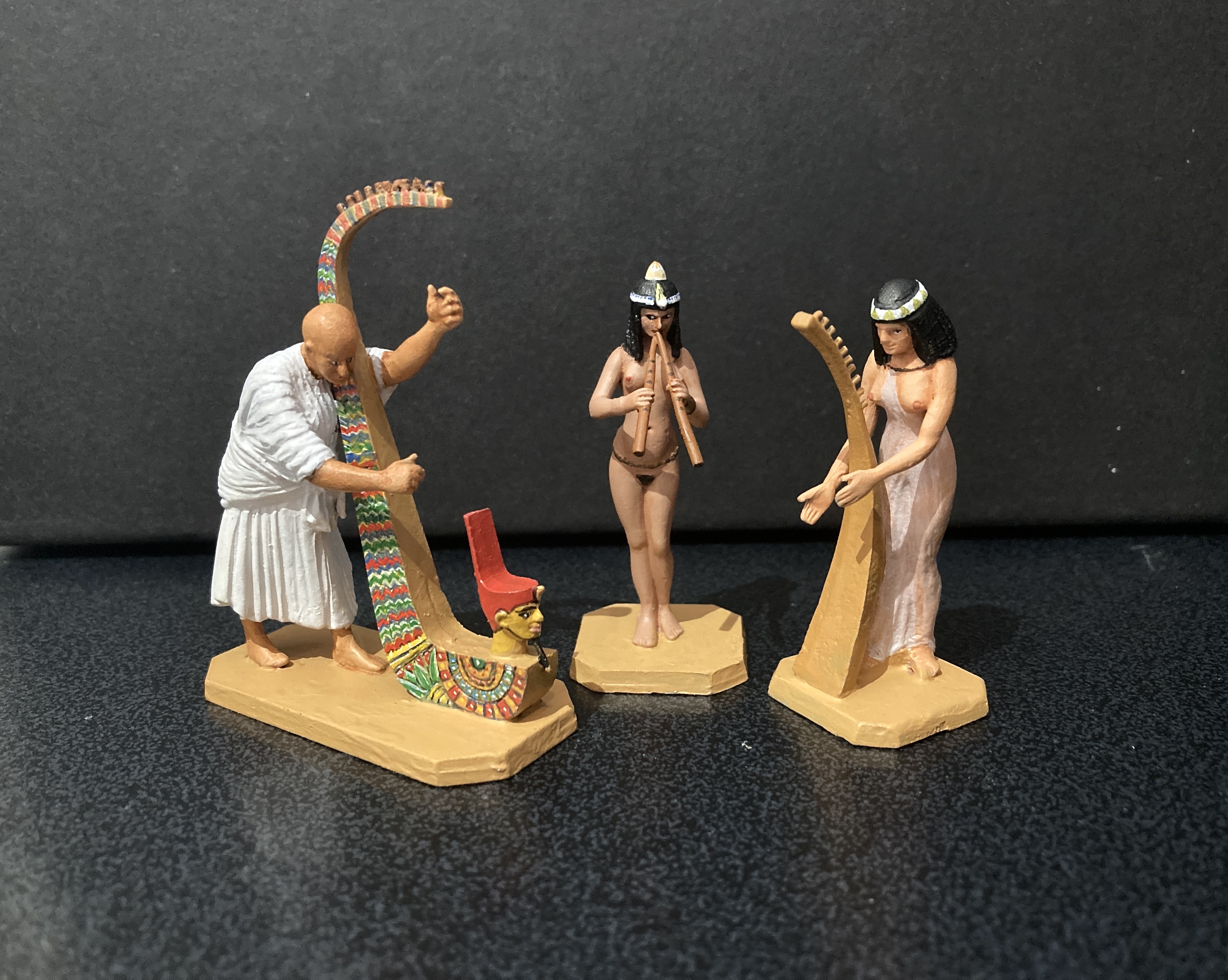 The one below shows musicians of the Pharoah’s court, there are a few more and I will update this section when I have them. My next post will show more of this range: the Nubians and Numidians (as described in the Rose catalogue), my preference would say they are from the Kingdom of Kush. Most of these castings have been supplied by John Eden, who currently owns Rose Miniatures. Click to see larger images.