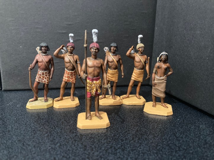 I have now completed my first batch of Rose miniatures, Nubian/Kush figures in Egyptian service, usually archers. The warriors are painted wearing animal skin kilts; either monkey, lion – probably not so frequent, giraffe – often depicted, or cheetah. This type of dress is often seen on burial chamber friezes. On the wooden burial figures, the kilts are usually cloth, like the Rose native Egyptian warriors. The girl has a pannier on her back suspended from a headband, also seen on burial chamber friezes.