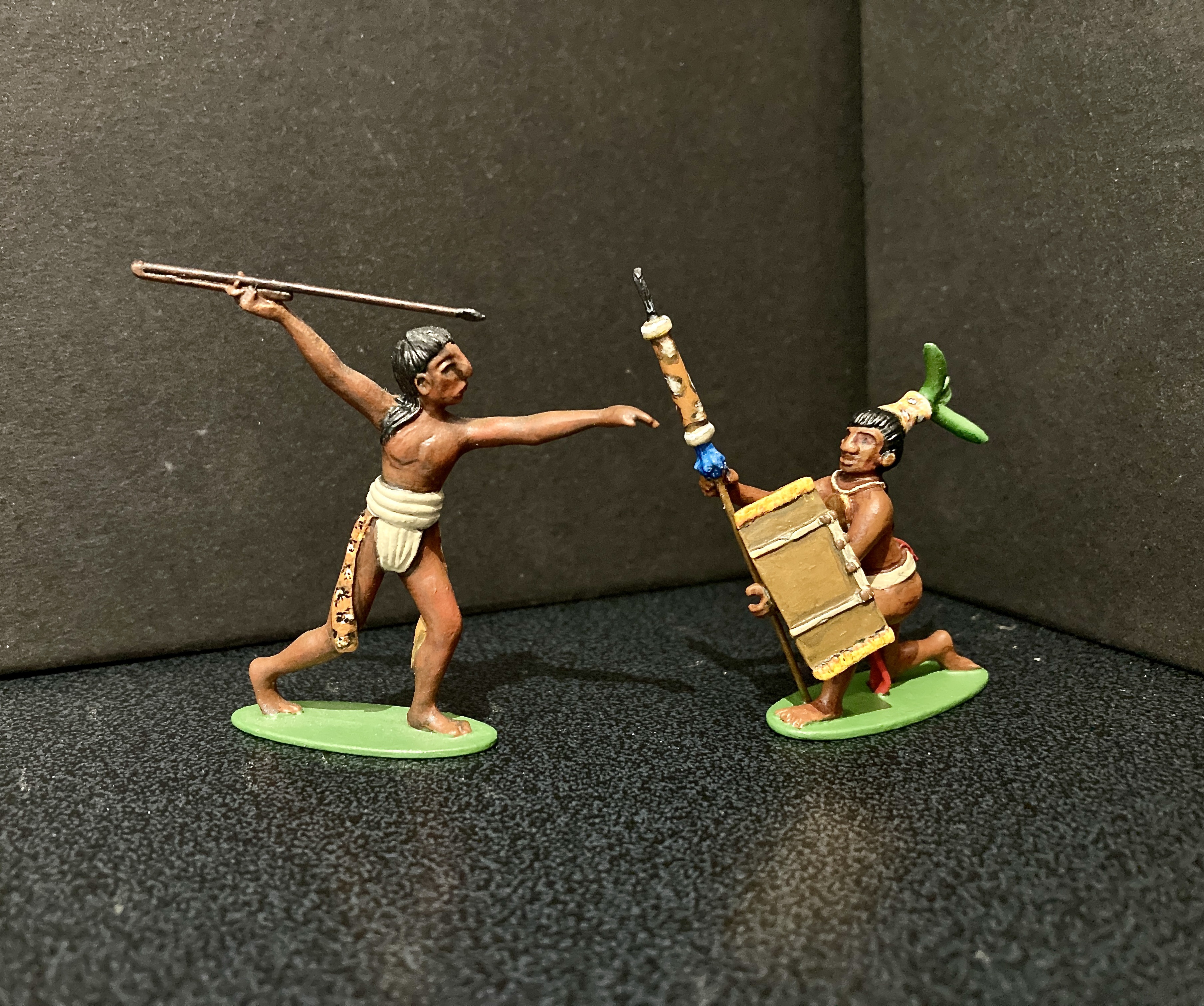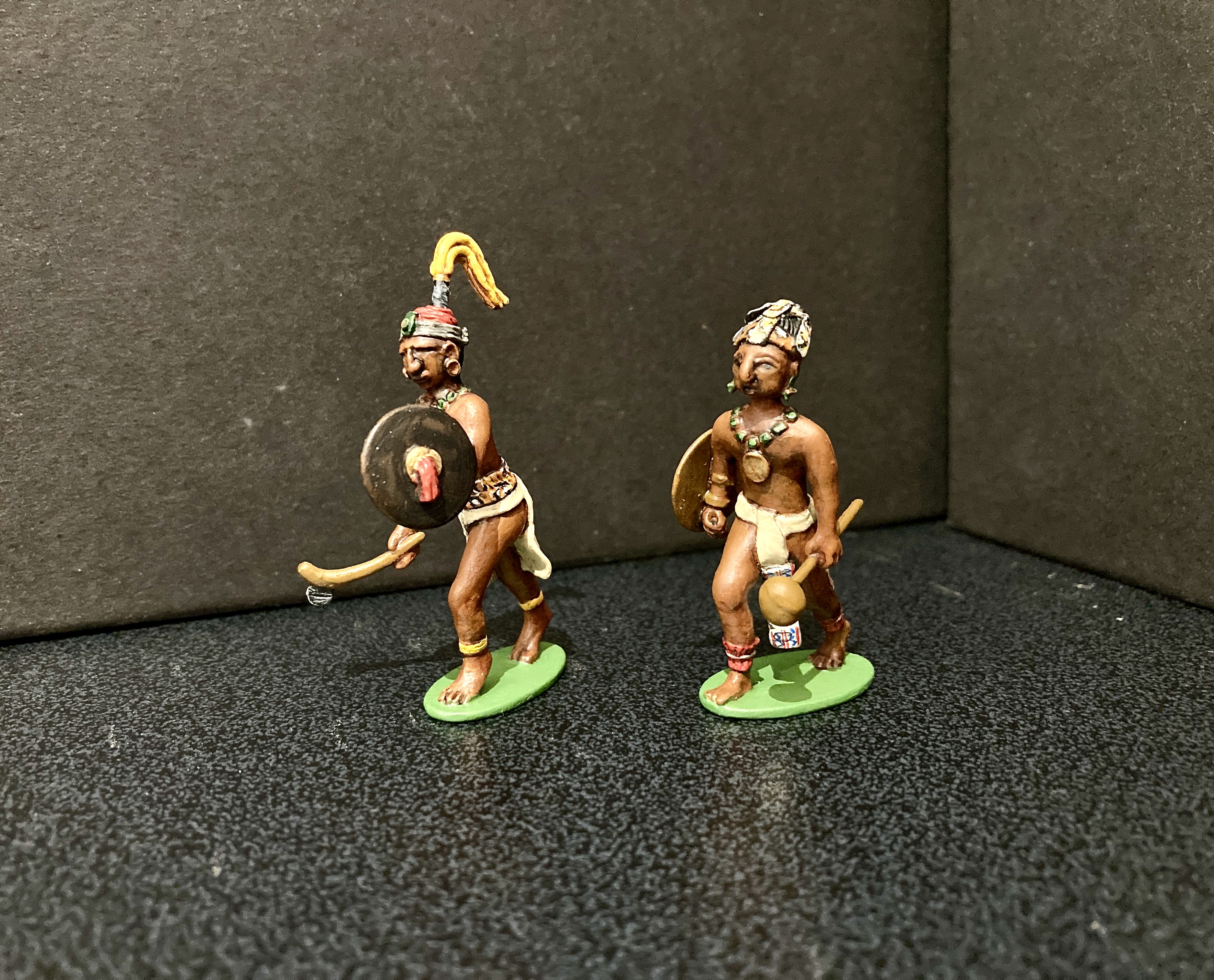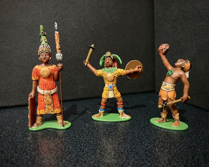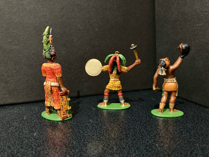 Below are more examples of his work. The two on the left are depictions of the intinerant workers who travelled the 19th century German states and cities. The one on the right speaks for itself. Comparing the groups you can see that he uses a specific artistic style. This is typical of individual sculpters of figures from earliest times, the swagger of French figures, the imperial arrogance of Britains, the solid, carved bulk of Marcus Hintons, the delicate superiority in Greenwood and Ball early 54mm gems, I could go on. It’s something that’s in danger of being lost in modern, machine sculpted figures. Click on any image to enlarge. All the figures below were painted by Robert, I painted the Mayans. I’ll add more of his figures when I find where I’ve stored them.