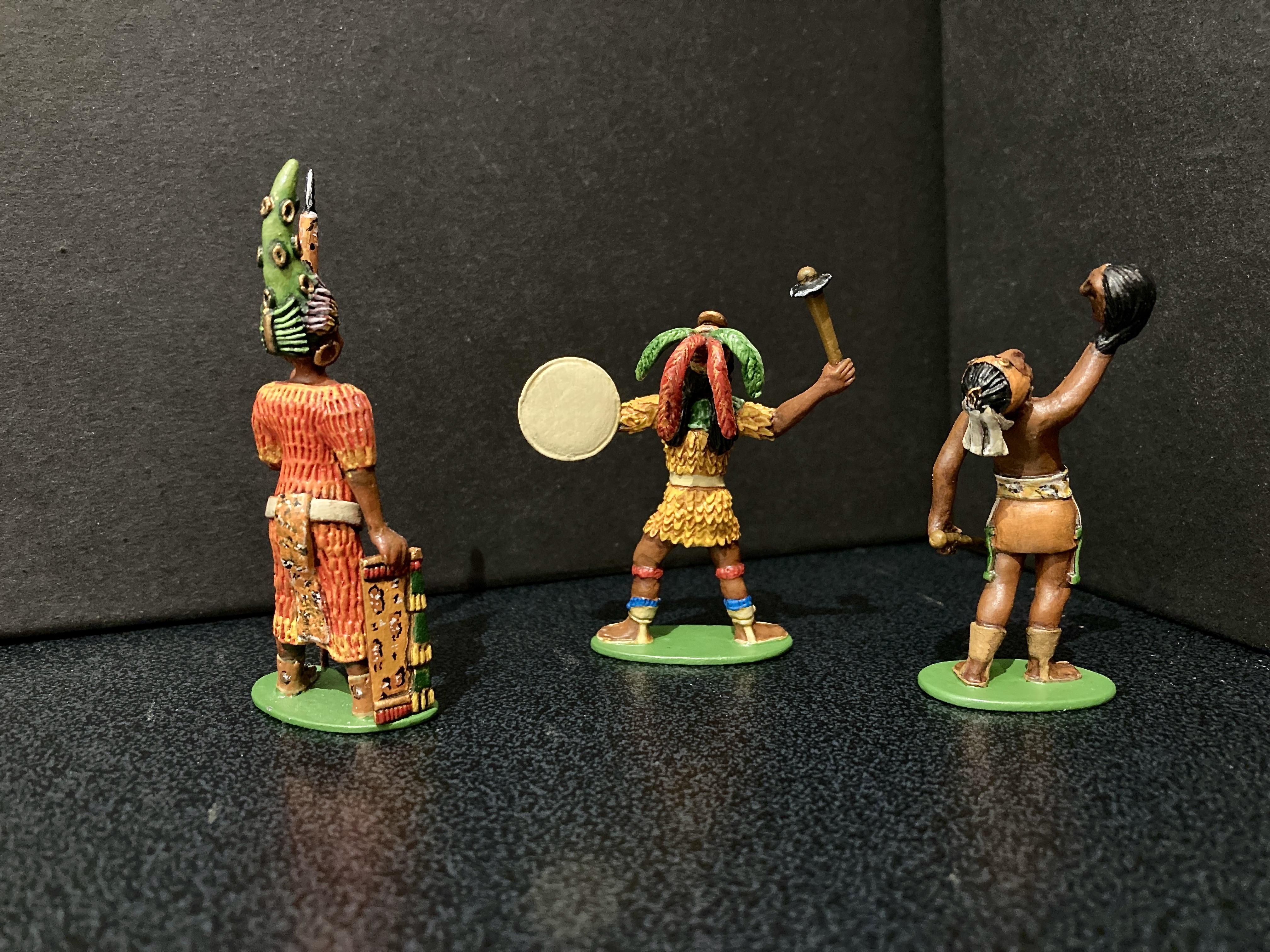 Robert Lloyd was my brother, he sadly passed away a few years ago. He was a superb artist and a museum restorer of medieval buildings, furniture and many other items. He could turn his hand at anything artistic. I have always sculpted, collected, bought and sold model soldiers, so he decided to try his hand at making some, a few military, but most cultural, mostly reflecting the history of his adopted country: Germany. Here are examples of his work. He never sold them commercially. The first examples are his set of Mayan warriors. They show his artistry and desire to sculpt Mayans as they appear in their own art.