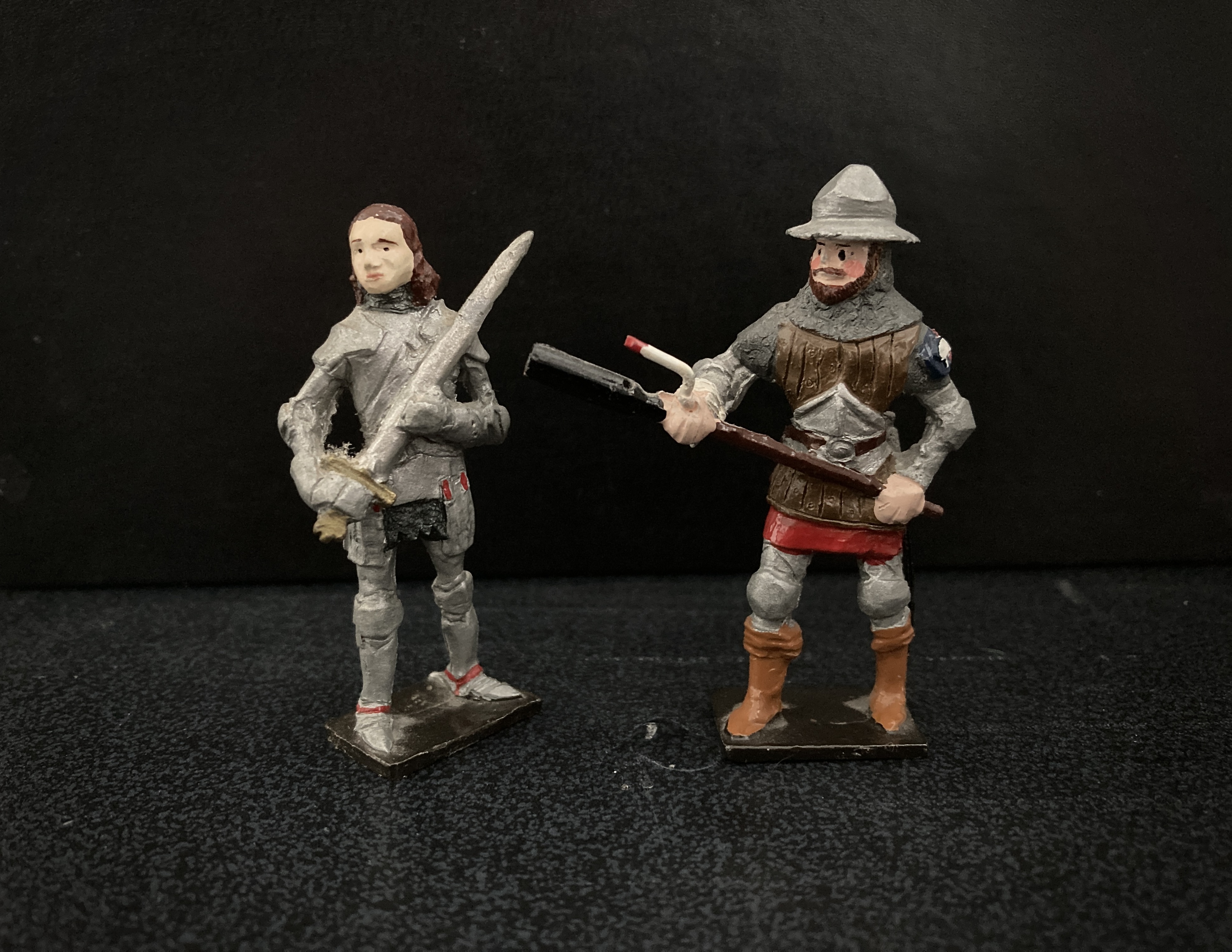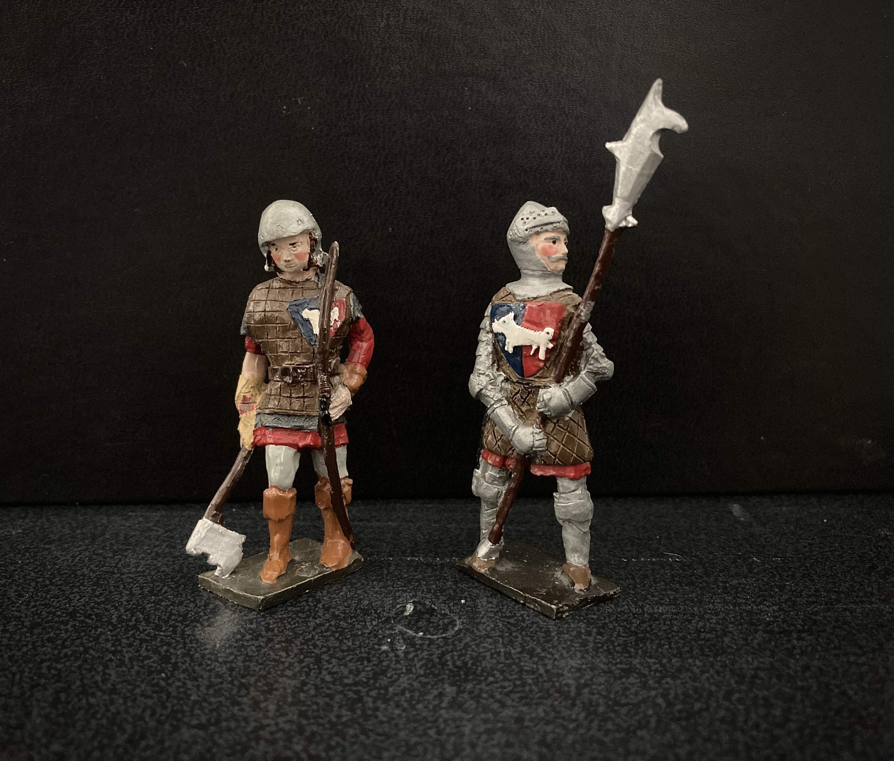 You might wonder what the link is between two small ranges; one Chinese Boxer rebellion and the other a group of Wars of the Roses, Battle of Bosworth Yorkist soldiers. The link is the sculptor and makers, Jan Scroby and husband Frank, who were amoungst the first collectors and dealers in the 1950’s to venture into making glossy, solid figures after WW2. Their Blenheim, Marlborough and Star ranges are well known and collected. Not so well known are the figures they produced on commission. Two of the most prominent toy soldier collectors and specialists; James Opie and Shamus Wade both commissioned figure from them. James wanted Chinese Boxer rebellion figures and Shamus wanted a large commission that became his Nostalgia range, now well known and collected. Part of his commission was a small extra range he called Oojah Cum Pivvi (an Indian term) which included the Bosworth group. Both of these groups are hard to come by, only a limited number being produced. I have been lucky in collecting examples over the years.