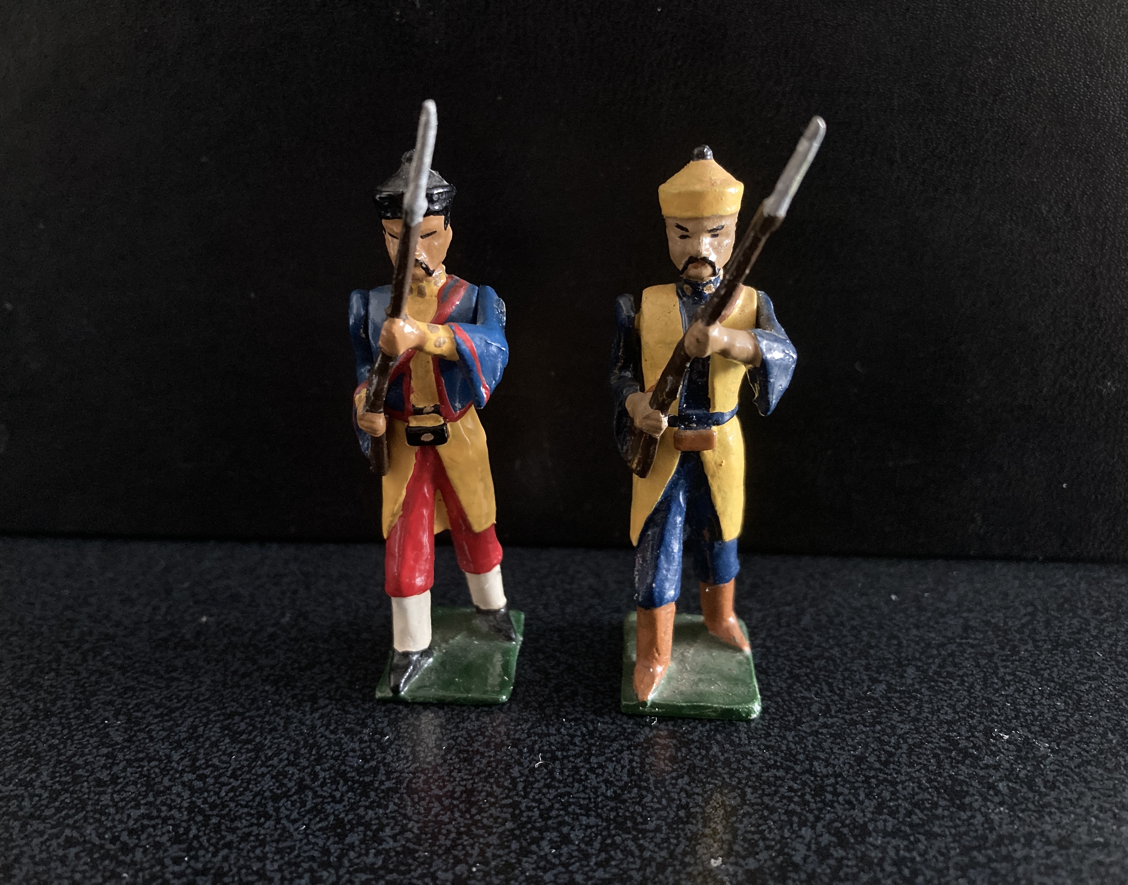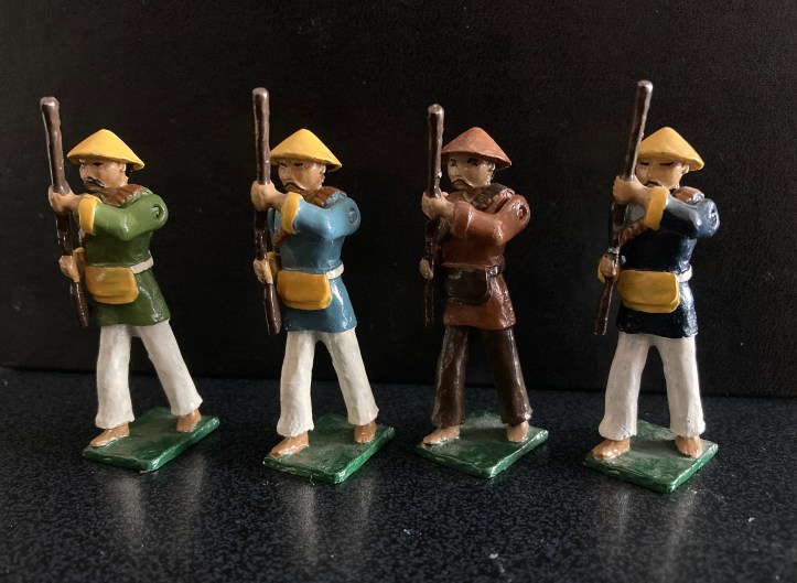 C1 Manchu Guardsman and C2 Chinese Levy with blunderbus. The Guardsman was only painted in these two colour schemes, the Levy figure was painted in five schemes; the four shown and one with a red jacket.